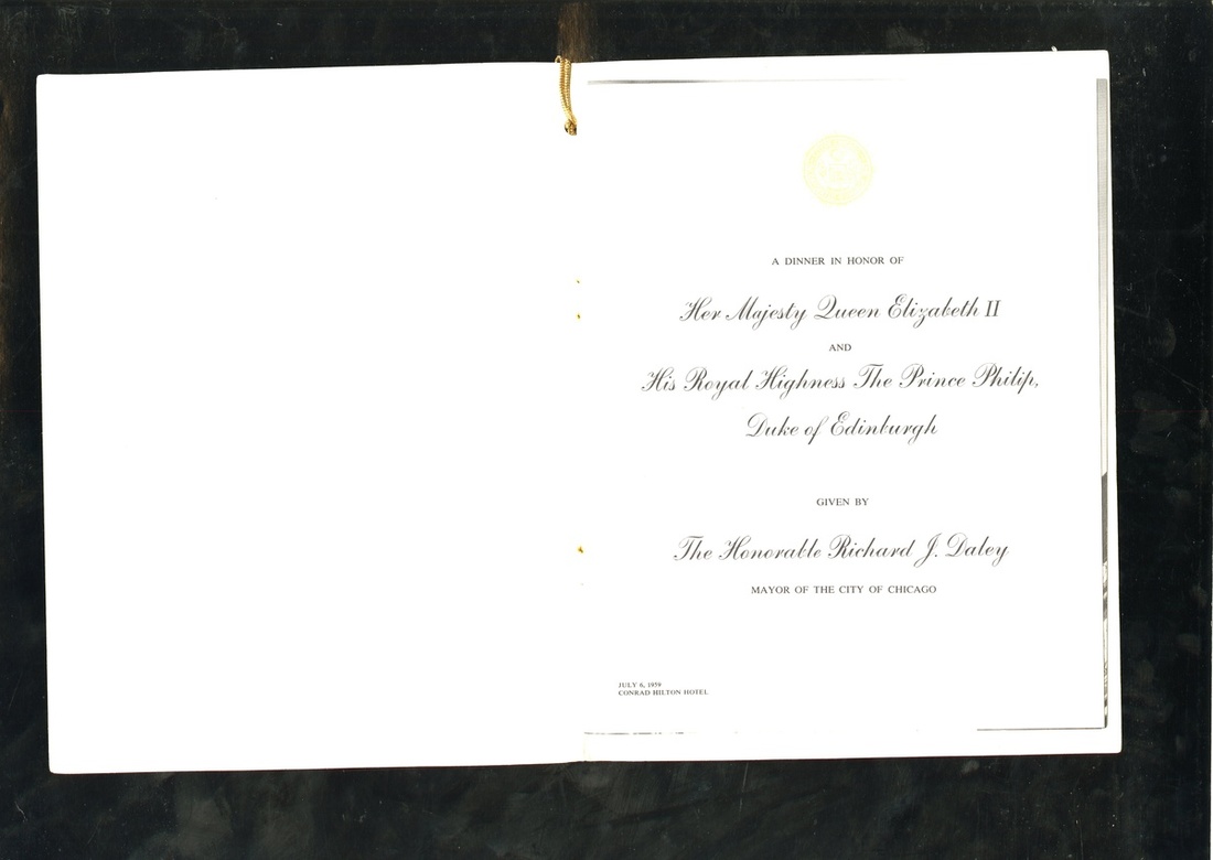 [British Royalty]: Queen Elizabeth II. Invitation and Menu for Her Late Majesty's Visit to Chicago, July 6, 1959 and other Ephemera. Program/Menu for the Dinner in Honor of Elizabeth II and Prince Philip given by Mayor Daly of Chicago, July 6, 1959. Autographed on back by a various local (?) attendees. Some light soiling to covers; Invitation, mailed envelope, and Official Pass (#484) for the event and Dress Suggestions. As part of a larger 45-day Royal Visit to the Canadian Provinces and four of the five Great Lakes, Queen Elizabeth II and Prince Philip made a brief 14-hour visit to Chicago. It was the first ever visit by a reigning British monarch to the city; also British Consul-General in Chicago Invitation to celebrate Her Majesty's Birthday, June 11, 1960; to meet Alan Green, MP, Minster of State, June 12, 1960; and to meet John Rodgers, MP and Lord Glentoran, Sept. 29, 1960.