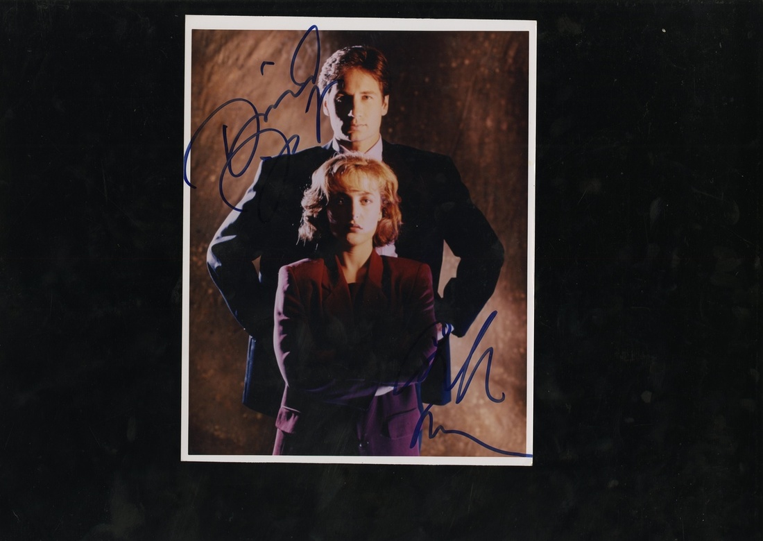 [Science Fiction: Television]. The X-Files. Autographed Photo of the series stars: David Duchovny (playing Fox Mulder) and Gillian Anderson (playing Scully). 8x10" color photo of the two, each signs in blue marker in large hand; also unidentified autographed 8x10.