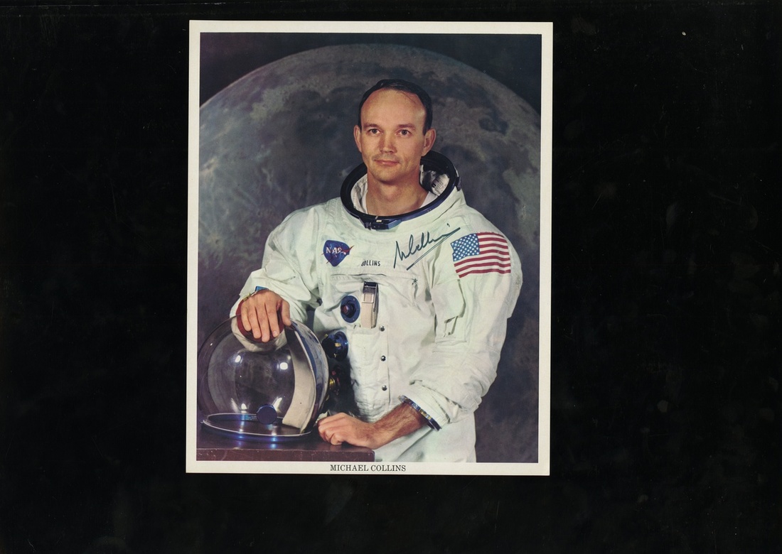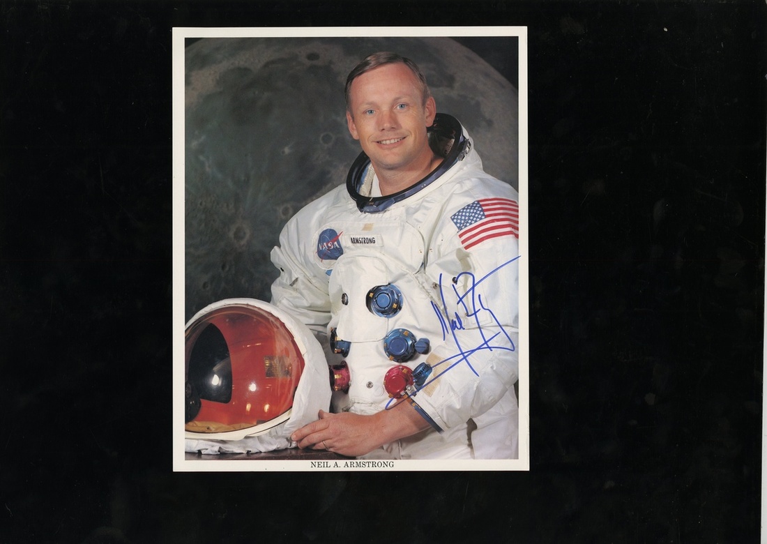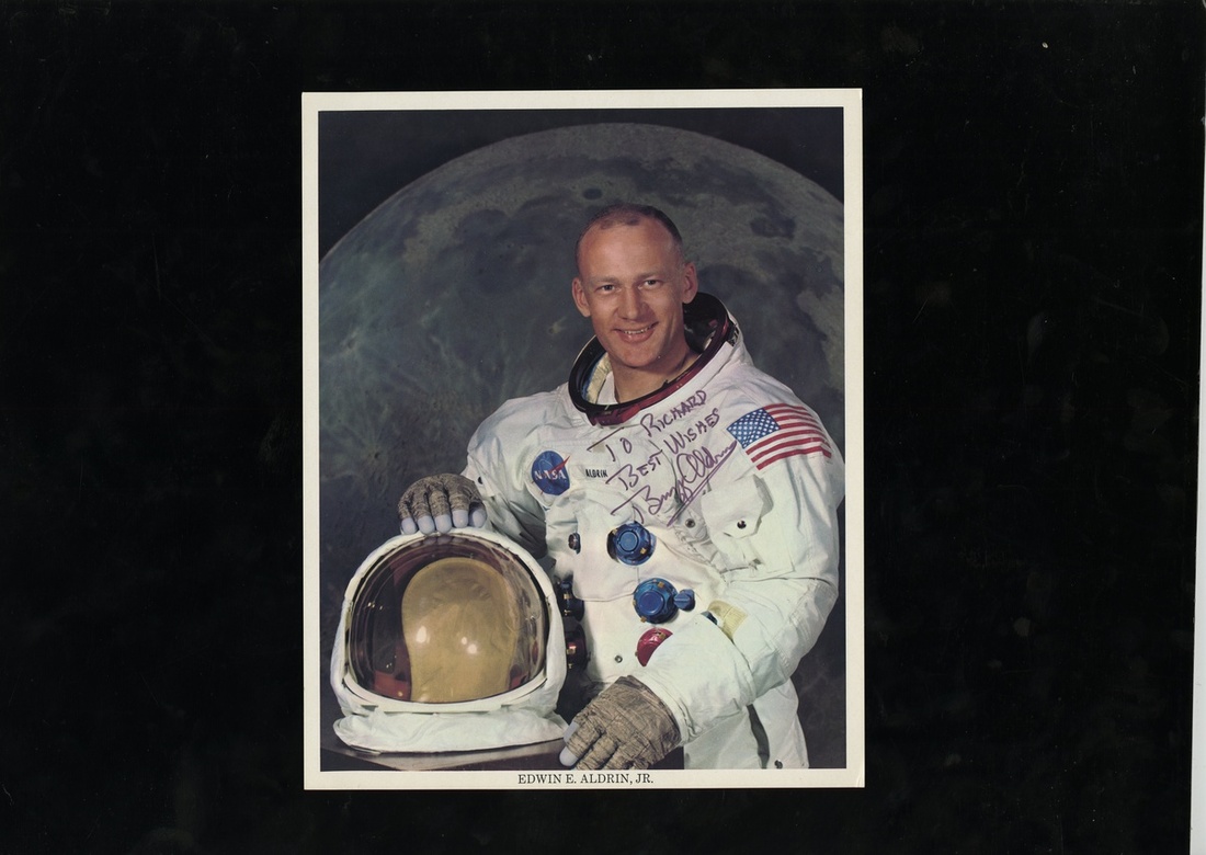 [Space Exploration]: Apollo 11. Set of Autographed Photos of the Astronauts who took part in the 1969 Lunar Landing. 8x10" color photos of each astronaut in full gear. Neil Armstrong (Mission Commander) and Michael Collins (Command Module Pilot) each sign in blue marker; while Edwin "Buzz" Aldrin signs "Best Wishes" to Richard in purple.