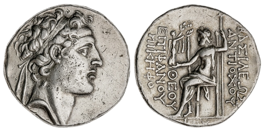 Seleukid Kings of Syria. Antiochos IV Epiphanes (175-164 BC). AR Tetradrachm. Uncertain mint, though the style of Ake-Ptolemais. 15.20 gms. Diademed head right, rev. Zeus enthroned left holding Nike and scepter, uncertain letters in ex. Some obverse hairlines. Very Fine.