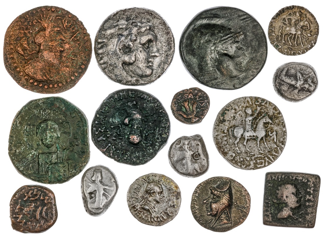Ancient Eastern Lot. Includes: AE 27 of Sinope, Time of Mithradates VI; Macedonian Herakles/Zeus Tetradrachm, rough surfaces; Byzantine Christ Follis; Judaean Prutah and Lepton; Achaemenid. Sigloi (3); Parthian Drachm of Artabanos I (Arsakes II) - possibly contemporary counterfeit, somewhat rough surfaces; Indo-Greek Kingdom in Baktria. Menander AR Drachm (scratches), Lysias square AE; an Indo-Scythian Drachm and AE, Indo-Parthian Tetradrachm; and a corroded "Napki Mulk" Drachm. About Fine-VF. (15)