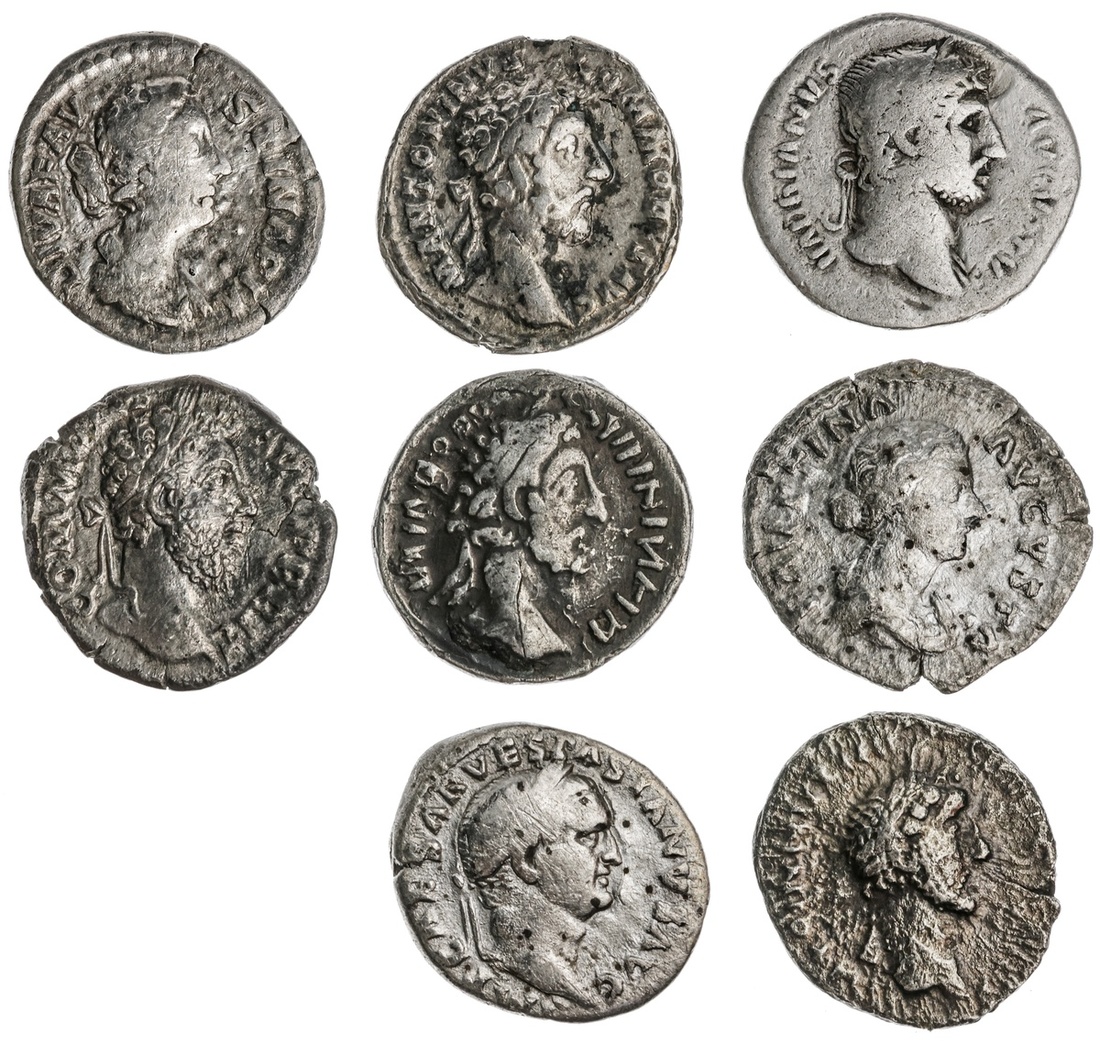Roman Imperial. Lot of AR Denarii. Issues of Vespasian (Pax seated reverse), Hadrian (Felicitas), Faustina Jr, Diva Faustina Jr; Commodus (2 - Virtus, Roma seated) the first with scratches; a very rough Antoninus Pius and a barbarous Divus M. Aurelius. Generally About Fine-Fine. (8)