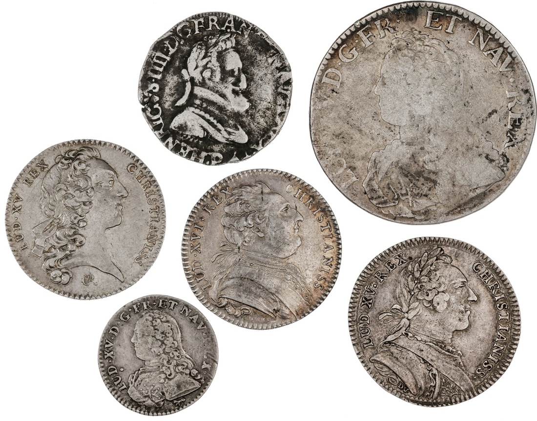 France. 16th-18th Century Silver Lot. Includes: Henri IV. Demi Franc, 1598. Lyons. Dark areas from deposits, cleaned, Fine; Louis XV. Ecu 1729 X. VG, 12 Sols 1729 A. About VF; Louis XV-XVI Silver Jetons 1731 Sec. du Roi 1731, Bretagne 1744, 1782. VF-EF. (6)