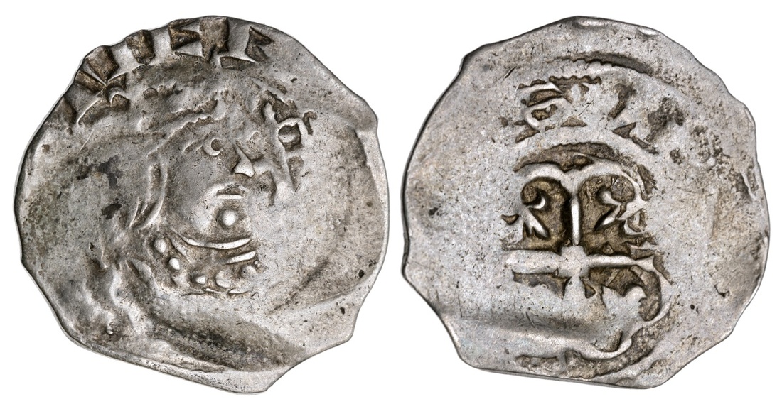 England. Norman Kings. Stephen (1135-1154). Cross Moline - "Watford" Penny. Uncertain mint and moneyer. 1.30 gms. Crowned bus right holding scepter; (S)TIEF(NE)--, rev. Cross Moline, fleur in each angle. N.873, S.1278. Flatly struck peripheries. Sharp profile. Very Fine.