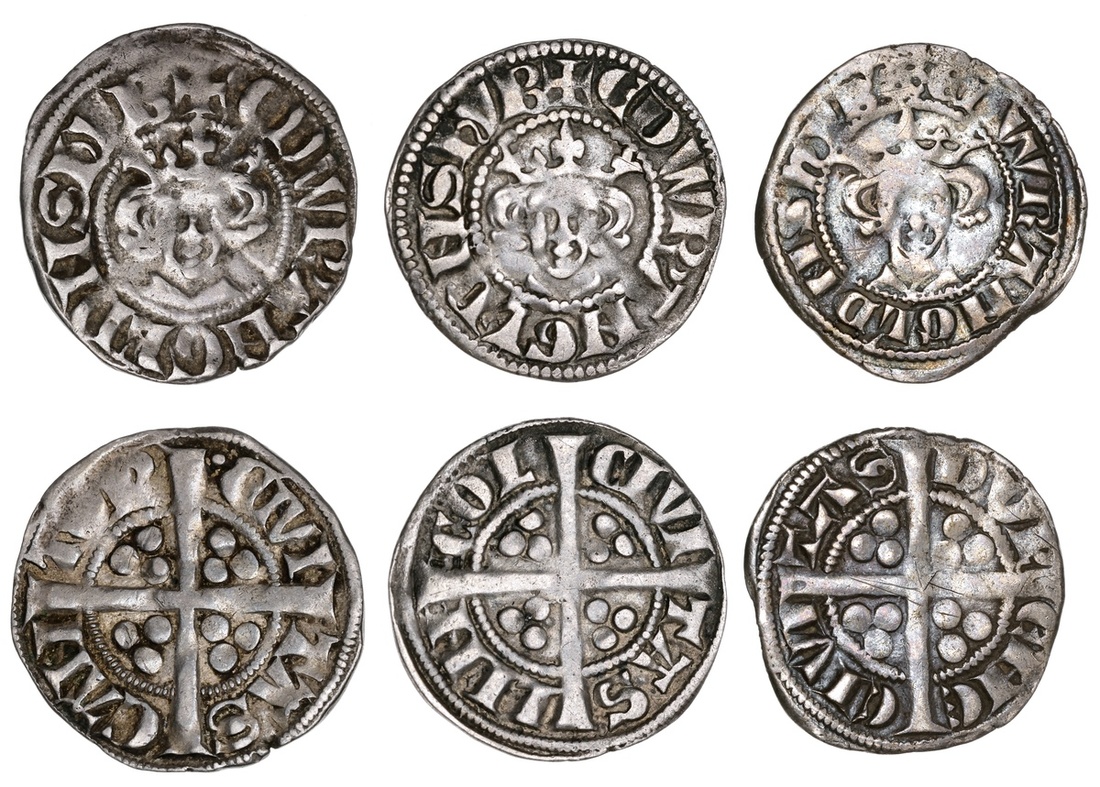England. Plantagenets. Edward I, "Longshanks" (1272-1307). Trio of Pennies. Canterbury, Durham, mm. cross Moline (S.1423) toned over a few old test scratches, and Lincoln. Crowned facing portrait. About VF-VF. (3)