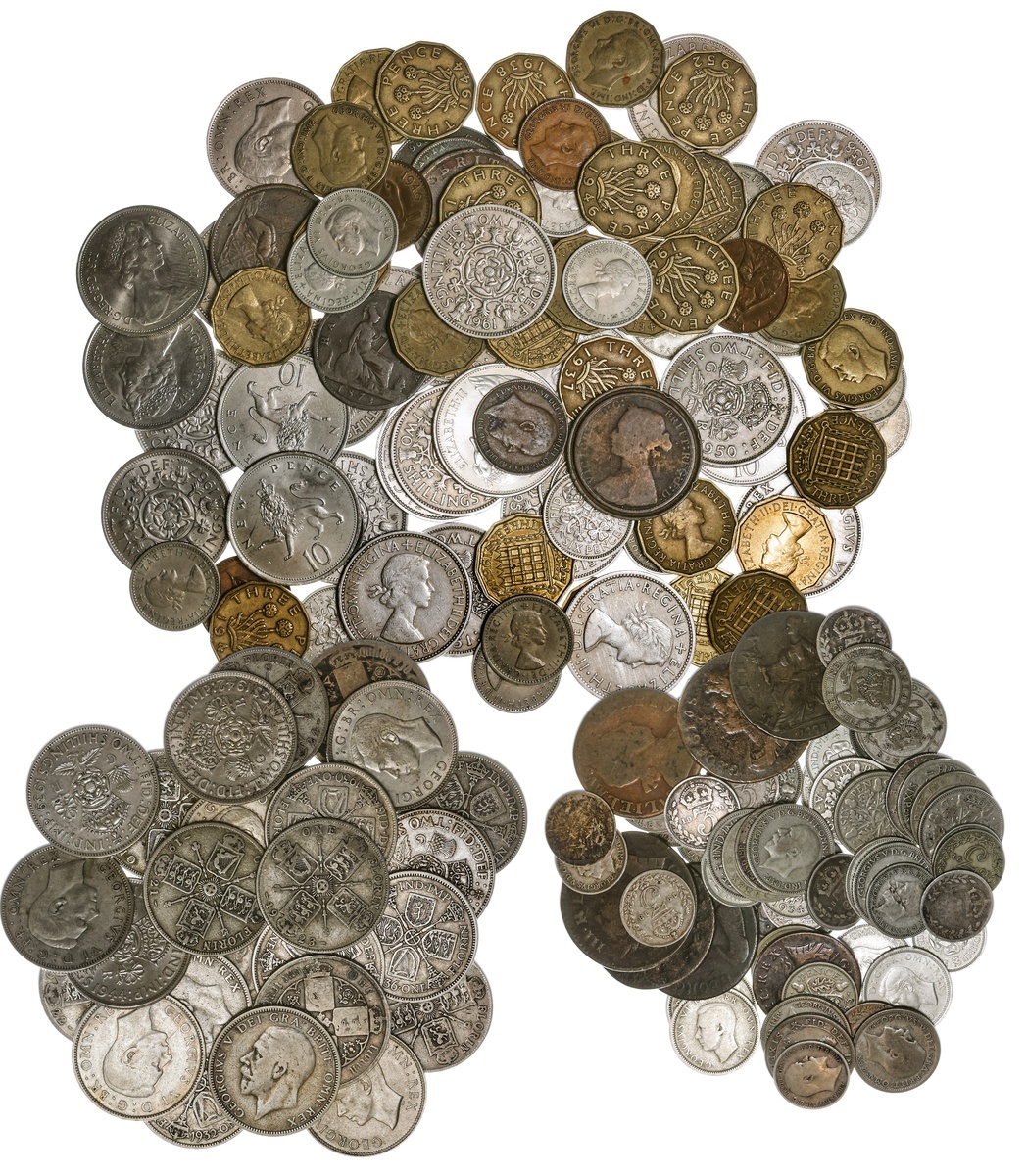 Great Britain. Miscellaneous Lot. Includes: Farthing 1746; Halfpennies, 1699, 1724, 1729, 1731, 1772, 1773, contemporary counterfeit 1774, Good-About Fine; other AEs (13); Silver, generally Edward VII to George VI and .500. Florins (26), Sixpence (28), Threepence (26); Nickel-brass Threepence, 1937-1952 Complete (the 1949 About Fine), other nickel-brass and copper-nickel (65). One Threepence damaged Poor, the rest Fair to EF.