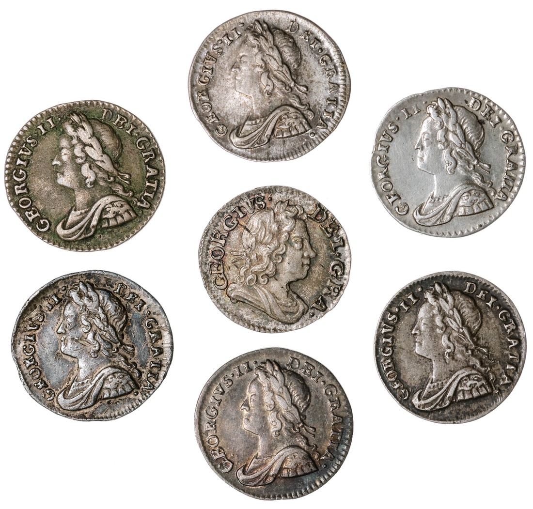 Great Britain. Group of Georgian Maundy Pennies. George I (1714-1727). 1716. Laureate, draped and cuirassed bust right. S.3657. Toned. EF; George II (1727-1760). 1737 About EF, 1739 scratch on cheek VF, 1740 Toned EF, 1750 VF, 1752/0 Near EF, and 1759 toned EF. Laureate, draped and cuirassed bust left. S.3715A. (7)
