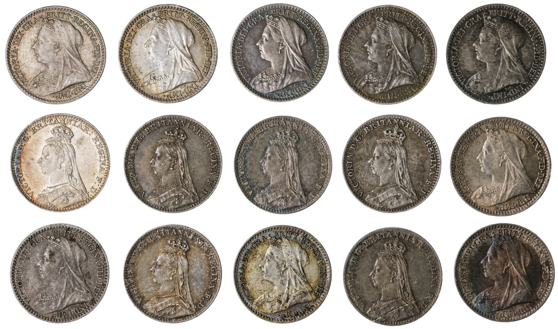 Great Britain. Victoria (1837-1901). Lot of Maundy Pennies. Jubilee bust: 1888, 1889, 1890, 1891, 1892 (2). S.3936; Old veiled bust: 1893, 1894, 1895, 1896, 1897, 1898, 1899, 1900 and 1901. S.3947; VF- Uncirculated. (15)