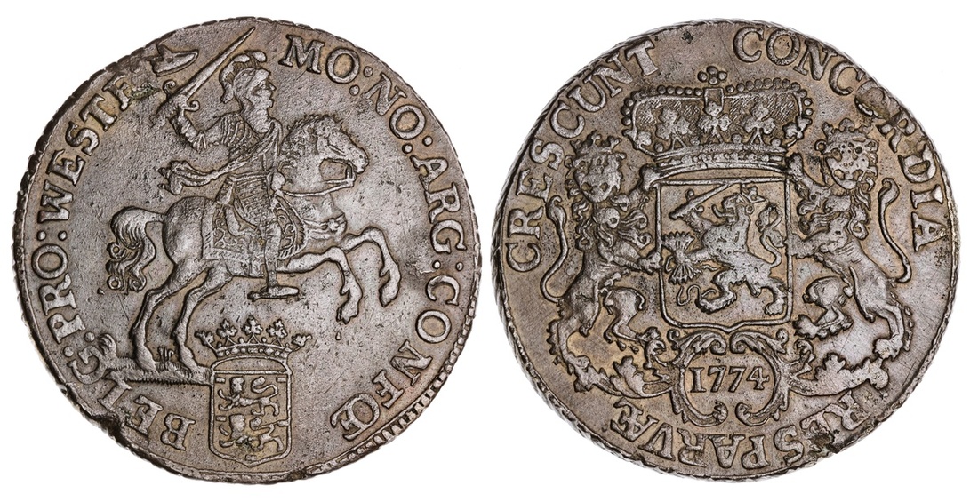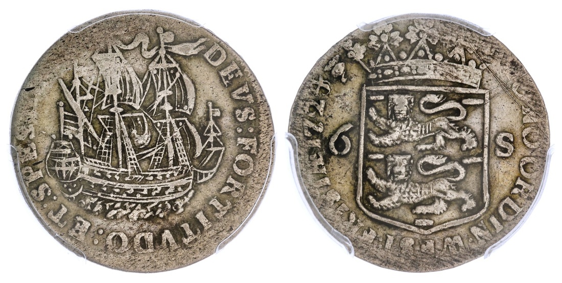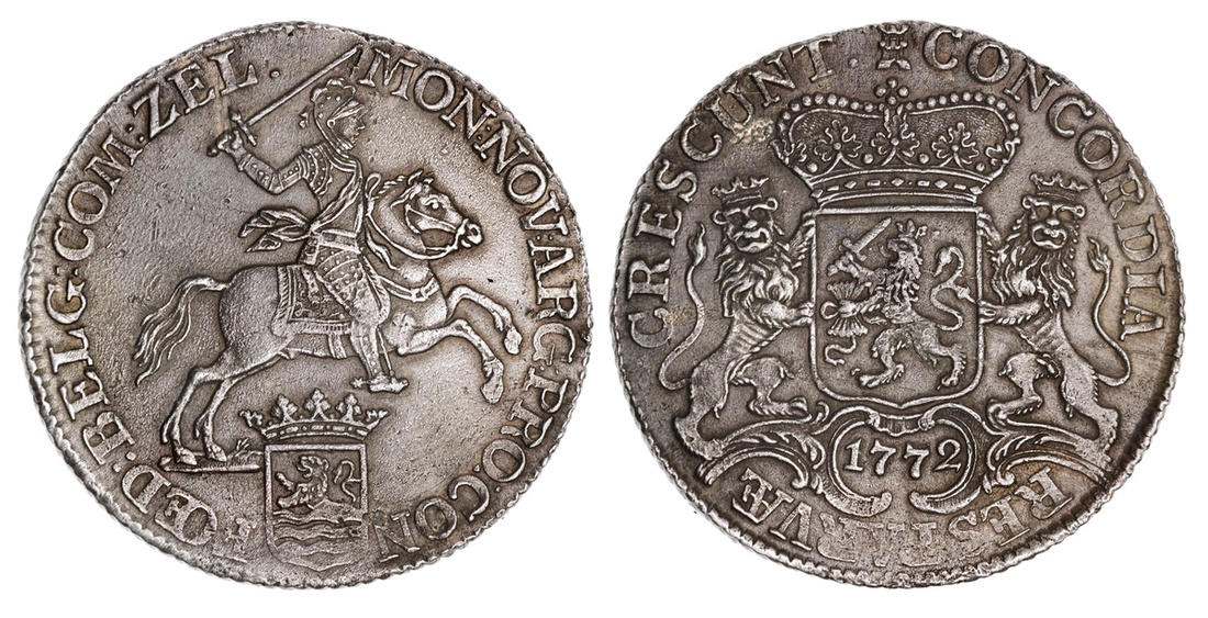 Netherlands. West Friesland. Ducaton, 1774. Knight charging on horseback right, Arms below, rev. Crowned Dutch Arms supported by lions, date in cartouche below. KM 127.3. Sea-salved, but even gun metal surfaces, grainy but not bad. About EF Details; 6 Stuivers, 1724/3. Ship at Sail. KM 102.2. PCGS Tooled - VF Detail; and Zeeland. Ducaton, 1772. Knight charging. Sea-salved, even pearly gray tone, magnification revealing grainy surfaces. EF Details. (3)