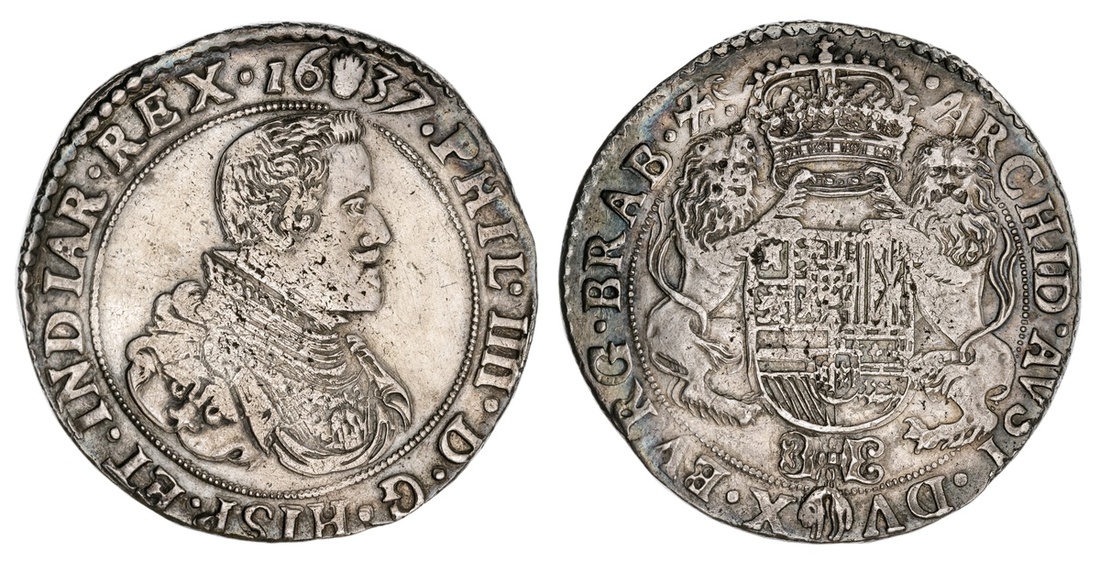 Spanish Netherlands. Brabant. Felipe IV (1621-1665). Ducaton, 1637 (hand). Antwerp. Draped and cuirassed bust right, rev. Crowned Arms in Order chain supported by lions. Dav.4454, KM 72.1. Evidence of not fully annealed metal as is common. Toned over some old contact marks in field. About Extremely Fine.