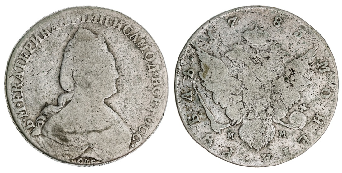 Russia. Catherine II, the Great (1762-1796). Ruble, 1783 MM. St. Petersburg. Crowned and mantled bust right, rev. Imperial eagle. C.67c. Very rare. About Very Good.