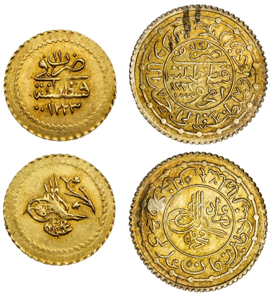 Turkey. Ottoman Empire. Mahmud II AH1223-1255/ 1808-1839 AD). ¼ Zeri Mahbub, acs. AH 1223 year 11. 0.80 gms. Toughra, flower before. KM 608. Toned. About EF; also contemporary jeweler's imitation ½ New Adli Altin, acs. AH 1223 year 19. 0.77 gms. Gold-washed silver. (2)