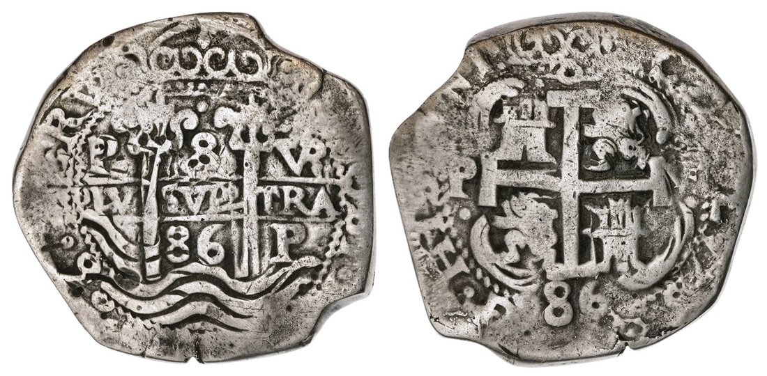 Bolivia. Carlos II (1665-1700). Cob 8 Reales, (16)86 P VR. Potosí. 26.80 gms. Crowned Pillars, PLVS VLTRA, denomination, assayer, mintmark and date across, Quartered Arms of Castile and Leon. KM 26. A few small old pocks in margin. Very Fine.