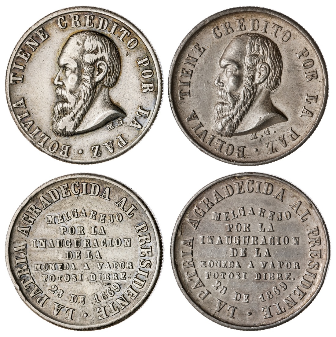 Bolivia. Republica. Installation of Steam Machinery at the Mint, 1869. Pair of Medals. Potosí. Silver, 24mm. 9.82 and 8.53 gms. Thick and thin modules. By M. Gordillo. Bust of President Melgarejo left, rev. Commemorative legend. Fonrobert 9721, 9720. Uncirculated and About EF. (2)