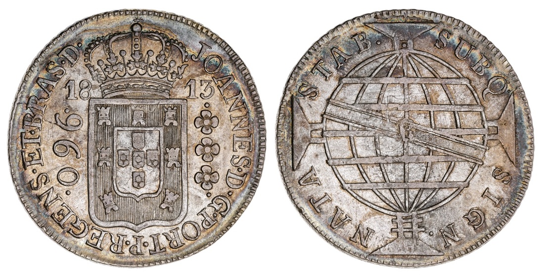Brazil. João, Prince Regent (1799-1818). 960 Reis, 1813 R. Rio de Janeiro. Crowned Arms, date across, value at left, row of three rosettes right, rev. Globe with sash over cross. KM 307.3. Overstruck on a Spanish Colonial 8 Reales, fragments of the undertype reverse visible on the reverse. Peripheral rainbow tone over a few old hairlines. AU.