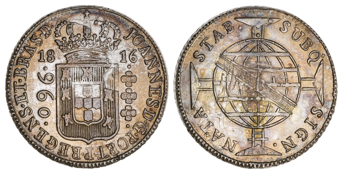 Brazil. João, Prince Regent (1799-1818). 960 Reis, 1816 B. Bahia. Crowned Arms, date across, value at left, row of three rosettes right, rev. Globe with sash over cross. KM 307.1. Overstruck on a Spanish Colonial 8 Reales, fragments of the undertype visible on both sides. Toned over some old hairlines in field. AU.