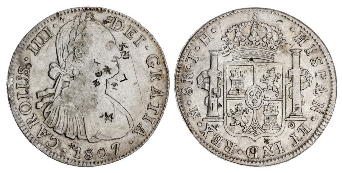 Mexico. Carlos III-IV. Pair of chopmarked 8 Reales. 1783 Mo FF. Numerous small chops both sides. NGC Chopmarked - Fine Details; 1807 Mo TH. Small chopmarks either side. Cleaned. EF Details. (2)