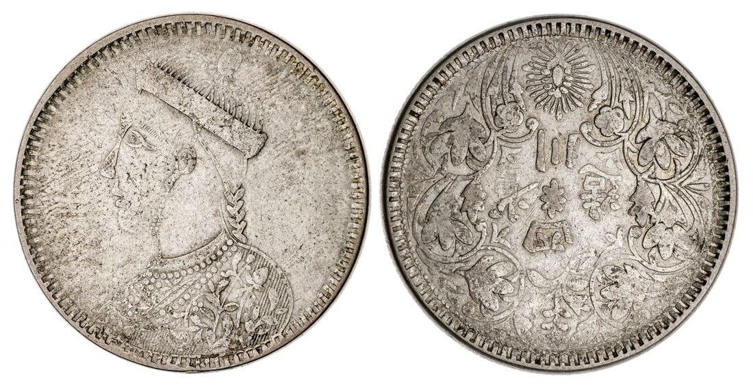 Tibet. Szechuan-Tibet Trade Coinage. Rupee, nd (1939-1942). Kanding mint. Somewhat larger portrait, with collar, rounded nose, of the Chinese emperor Kuang-hsu styled after the British Indian Rupee of Victoria, rev. Vertical rosette at center; si chuan sheng zao ("made in Szechuan), wreath of branches with cusps and flowers (also derived from the British Indian Rupee). Y.3.3, L&M 359. Evidence of die impurities. About EF.