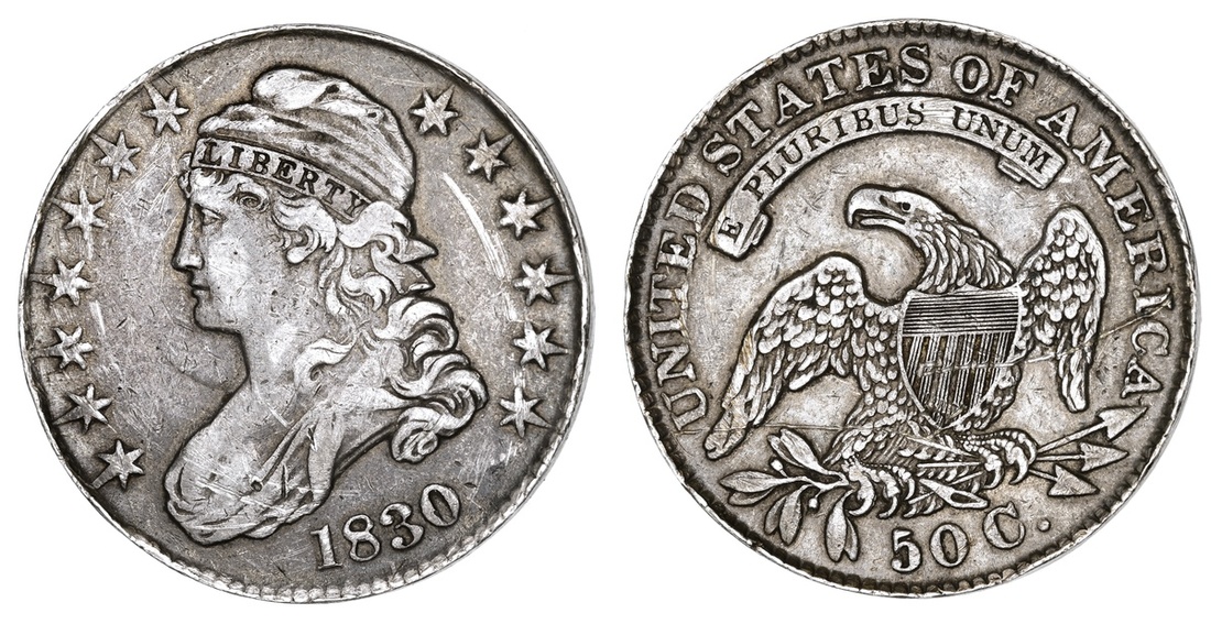 1830 Capped Bust Half Dollar. Surface and edge scratches. VF-EF details.