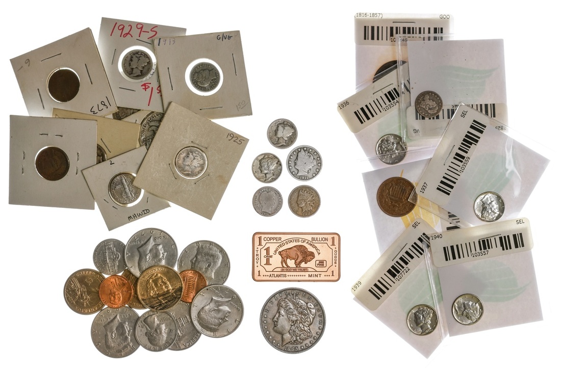 U.S. Oddments. Includes: 1885 Morgan EF; 1829 Capped bust Half Dime VG; 1864 2 Cent VF; 1822 Large Cent with edge ding; 1853 Seated Liberty Dime with arrows (obv. scratch) VG; Mercury Dimes (10) well circulated to BU; 1928-S Walking Liberty Half About VG; Franklin and '64 and '66 JFK Halves, Barber Dimes (2), a V Nickel, a few low-grade Flying Eagle and Indian Cents and $11.82 FV in clad; also One Ounce Copper bar.