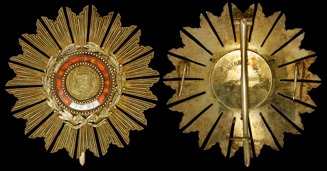 Peru. Order of the Sun of Peru. Breast Star. 76mm. Gilt, silver-gilt and red and white enamel. By Lemaitre, Paris. Vertical pinback with sidehooks. Extremely Fine.