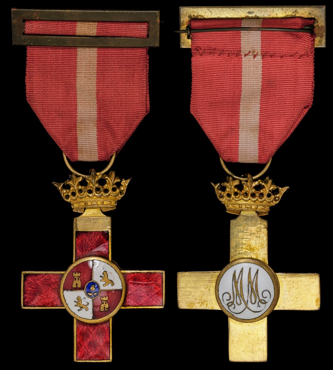 Spain. Kingdom. Order of Military Merit. Knight's Badge. 36.7mm (not including crown suspender). Silver-gilt, gilt and red, white and blue enamels. With slid ribbon bar. Very Fine.