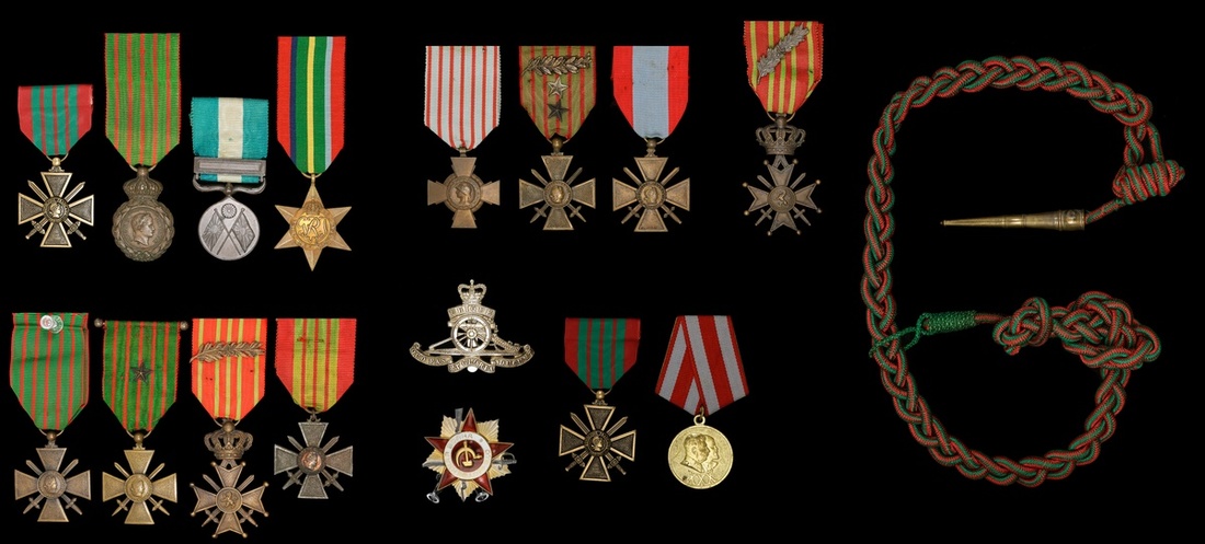 World Military Medals and Orders Lot. Includes: France. Croix de Guerre. 1914-1918 (3) - one with bronze and silver star and oak leaf, one with one bronze star; 1939-1940; Foreign Operations Cross, Combattant's Cross, St. Helena Medal, 1939-45 cross modern reissue, and shoulder braid; Belgium. WWI Croix de Guerre (2) - one with oak leaf; British WWII Pacific Star, and modern hat badge; USSR. Order of the Patriotic War; and 30th Anniversary of the Soviet Army and Navy 1948 Medal; Japan. 1894-95 Sino-Japanese War Medal. Fine-EF. (16)