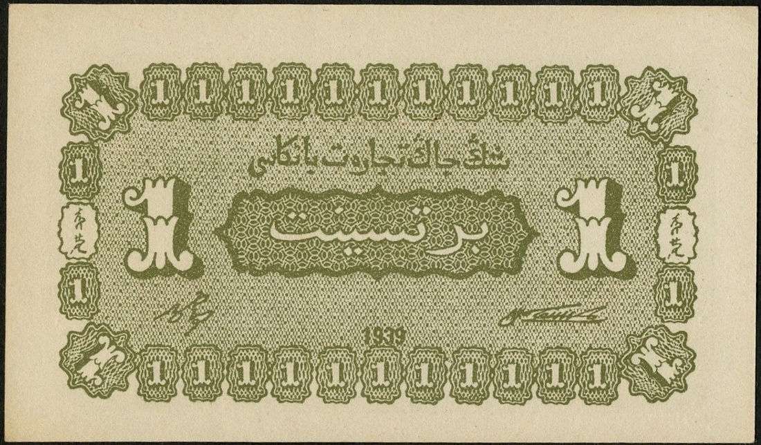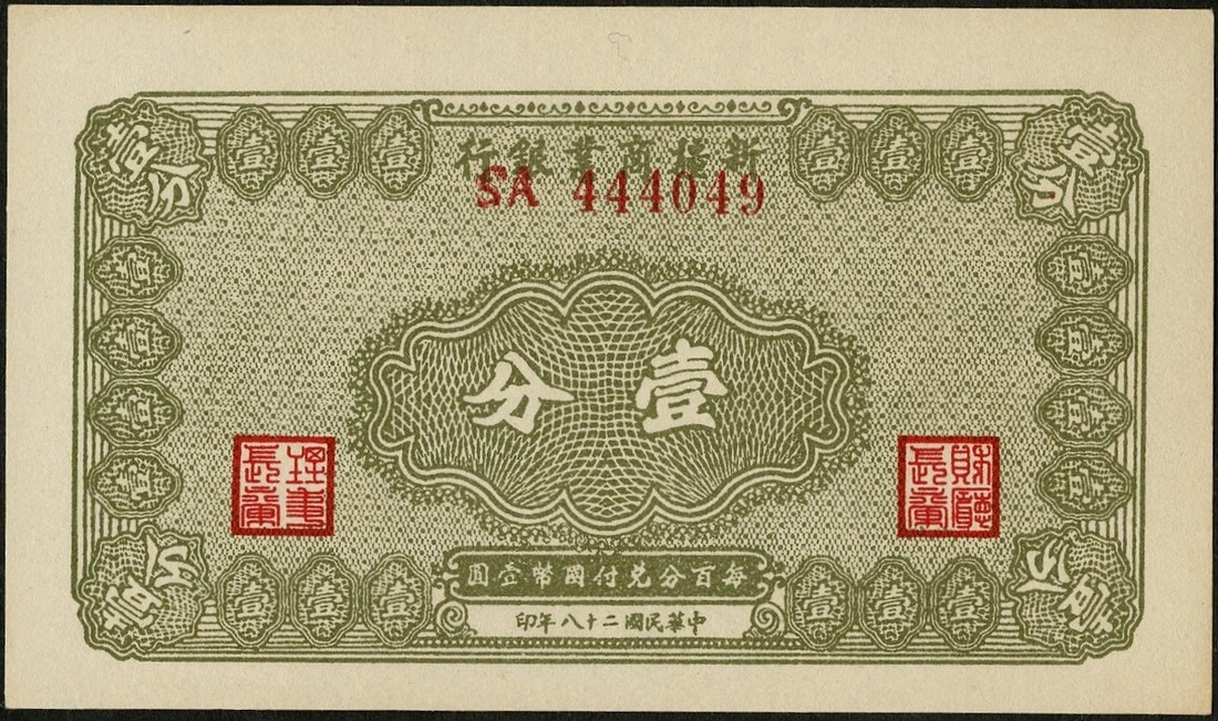 China. Sinkiang (Xinjiang). Sinkiang Commercial and Industrial Bank. 1 Fen. 1939. P-1743. Olive-green. Chinese; Uighur. Uncirculated.