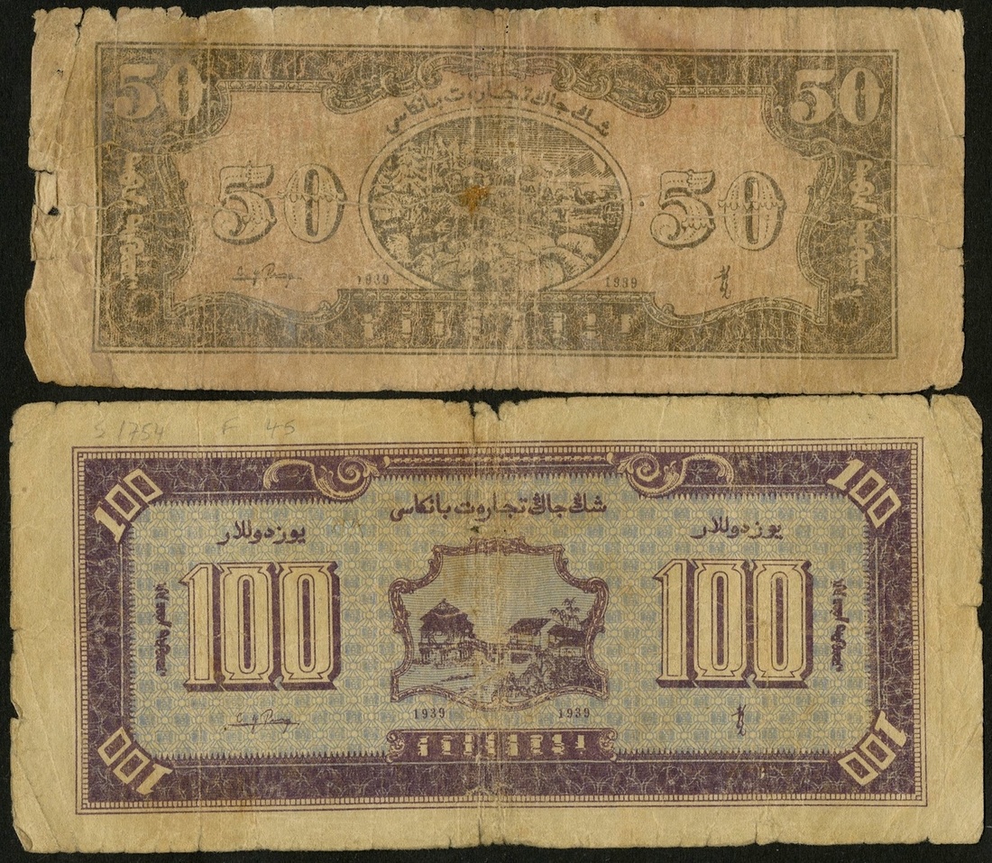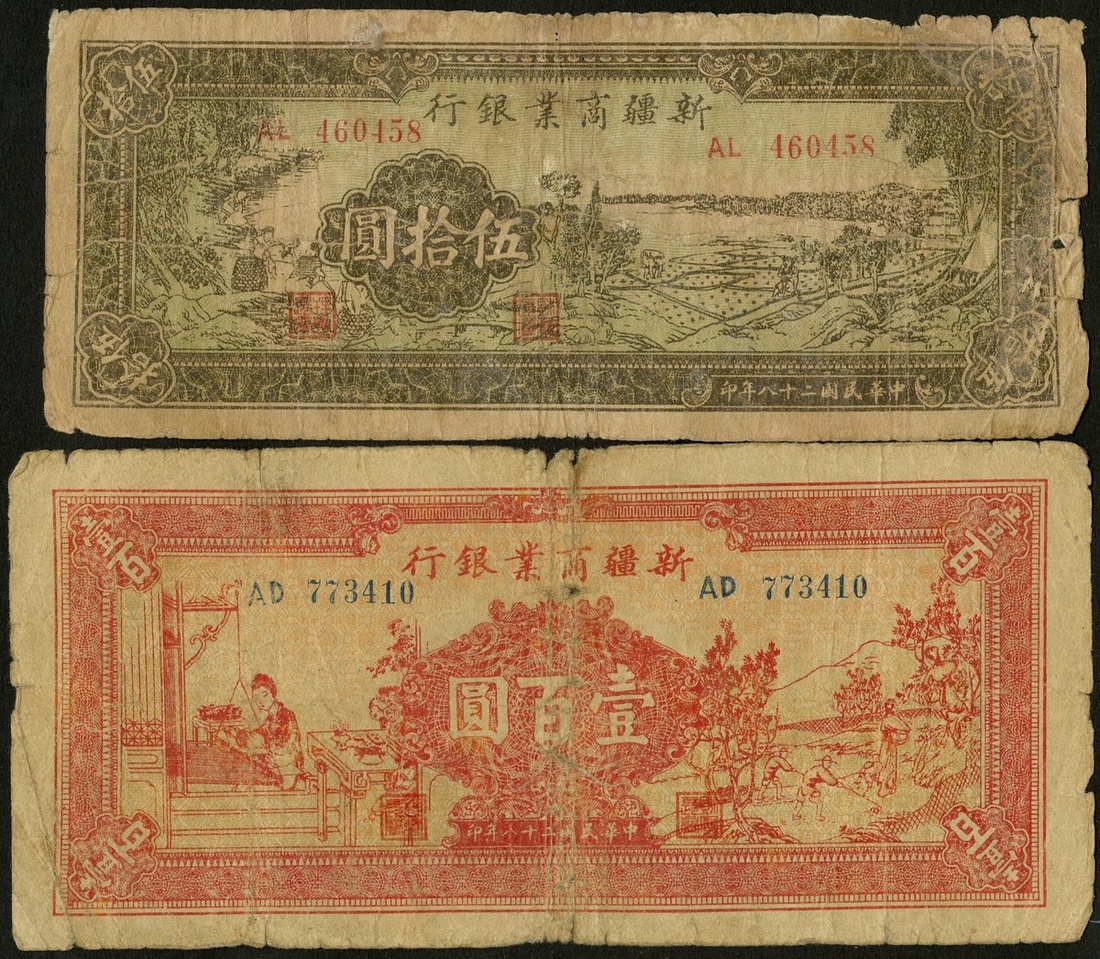 China. Sinkiang (Xinjiang). Sinkiang Commercial and Industrial Bank. 50 and 100 Yuan. 1939. P-S1753, 1754. Men fishing at left, shoreline right; Woman weaving at left, men farming at right. Very Good. [2]