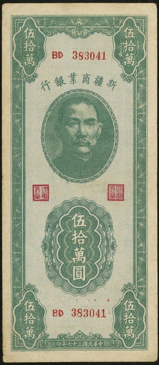 China. Sinkiang (Xinjiang). Sinkiang Commercial and Industrial Bank. 500,000 Yuan. 1948. P-S1778. Green. Sun Yat-sen upper center; Bank building on back. About EF.