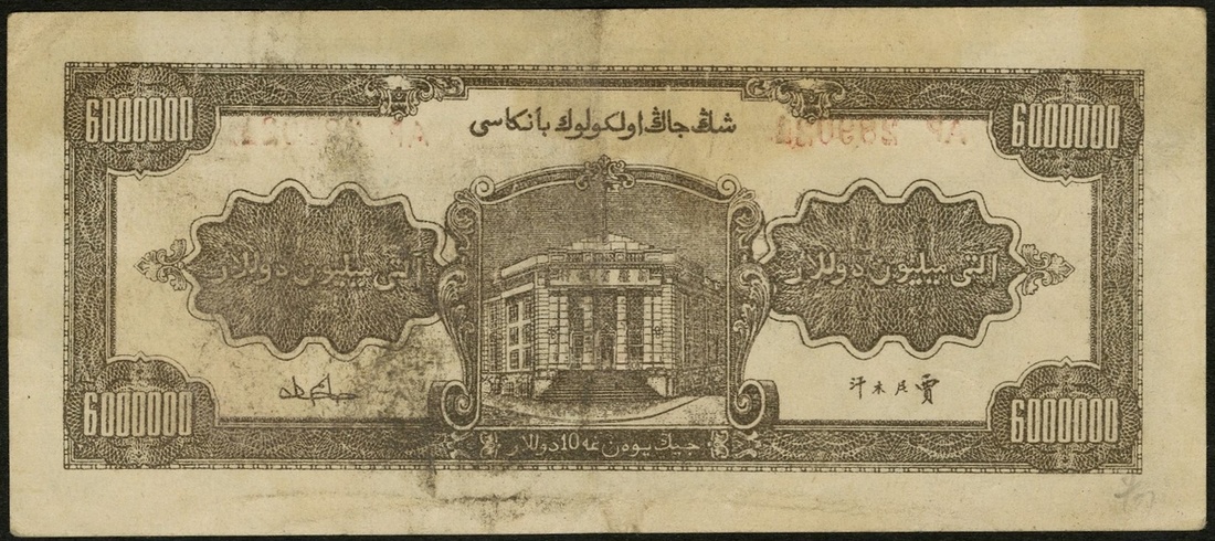 China. Sinkiang (Xinjiang). Sinkiang Provincial Bank. 6 Million Yuan. 1948. P-S1788. Dark blue, yellow and red. Sun Yat-sen portrait at left; Bank building back center. EF