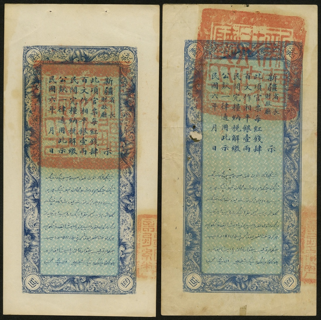 China. Sinkiang (Xinjiang). Sinkiang Provincial Government Finance Department - Treasury. Pair of 400 Cash. Year 10 (1921). P-S1825. Blue and yellow. VF with small paper loss back left; and XF with pinholes in far margin. [2]
