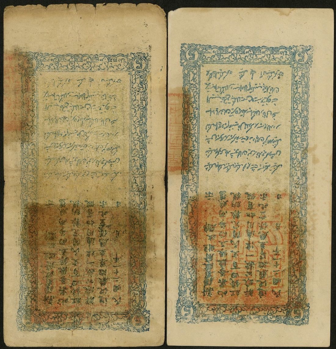 China. Sinkiang (Xinjiang). Sinkiang Provincial Government Finance Department - Treasury. Pair of 5 Taels. Year 21 (1932). Vertical formal. Blue; black back. Light edge nicks. Fine and Good VF. [2]