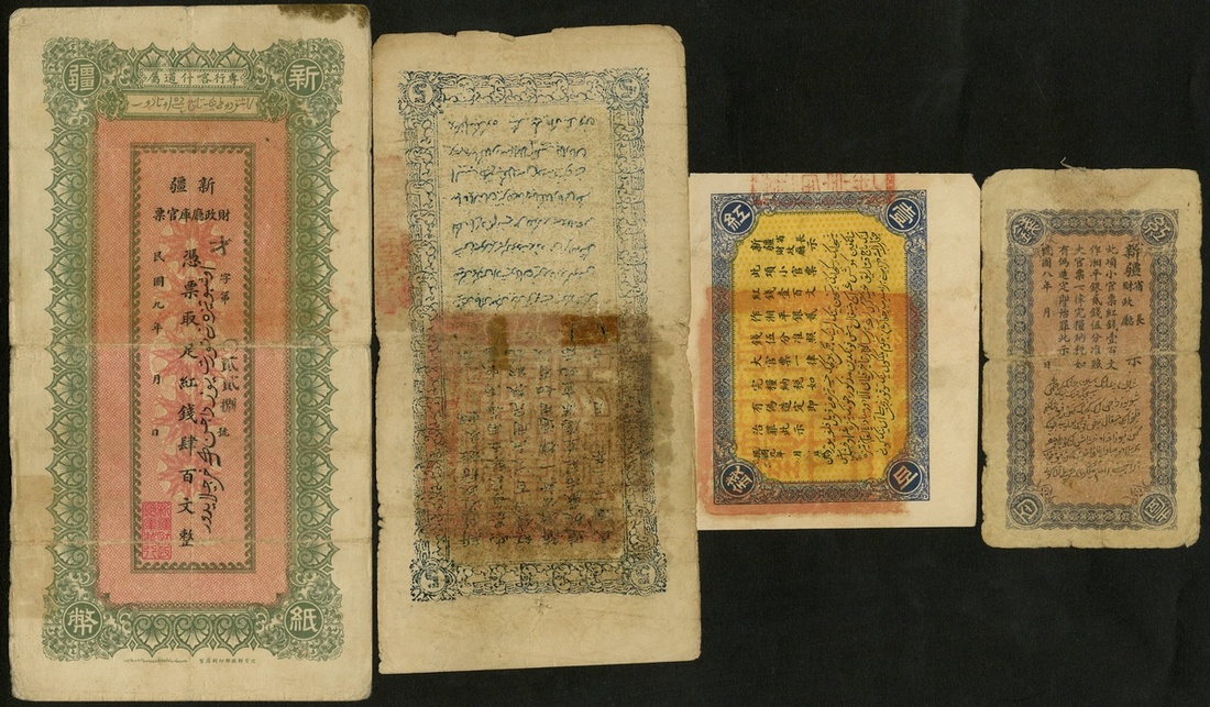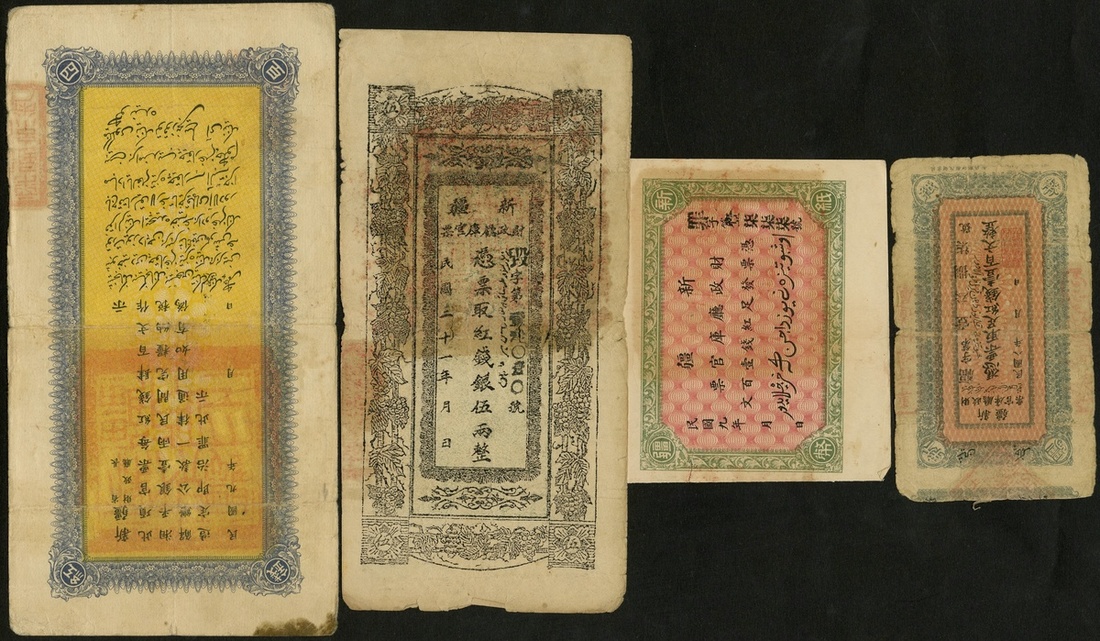 China. Sinkiang Provincial Government Finance Department - Treasury. Grouping. 100 Cash. Year 8 (1919). P-S1815. Blue on pink. VG; Year 9 (1920). P-S1820. Small edge spilt in margin and top left cornertip missing. VF; 400 Cash. Year 9 (1920). P-S1822. Fine; 5 Taels. Year 21 (1932). P-S1869. Split and rent at center tape backed. VG. [4]