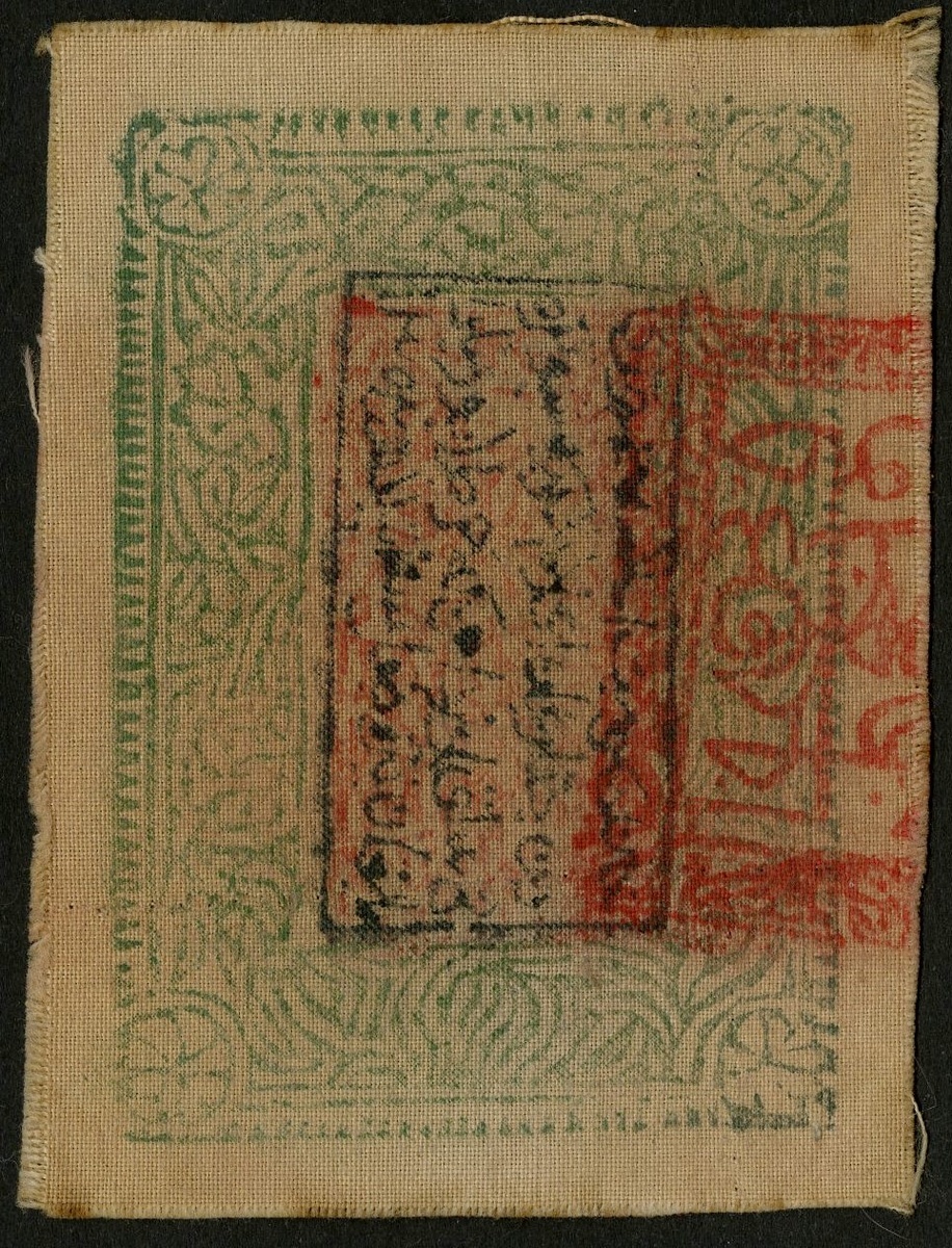 China. United Islamic Republic of East Turkestan. Revolutionary Government, Khotan. 100 Silver Dachin. AH 1352 (1933 AD). P-S3039. Cloth. Dark green, black text on red. Large red hand-stamped seal. About Very Fine.