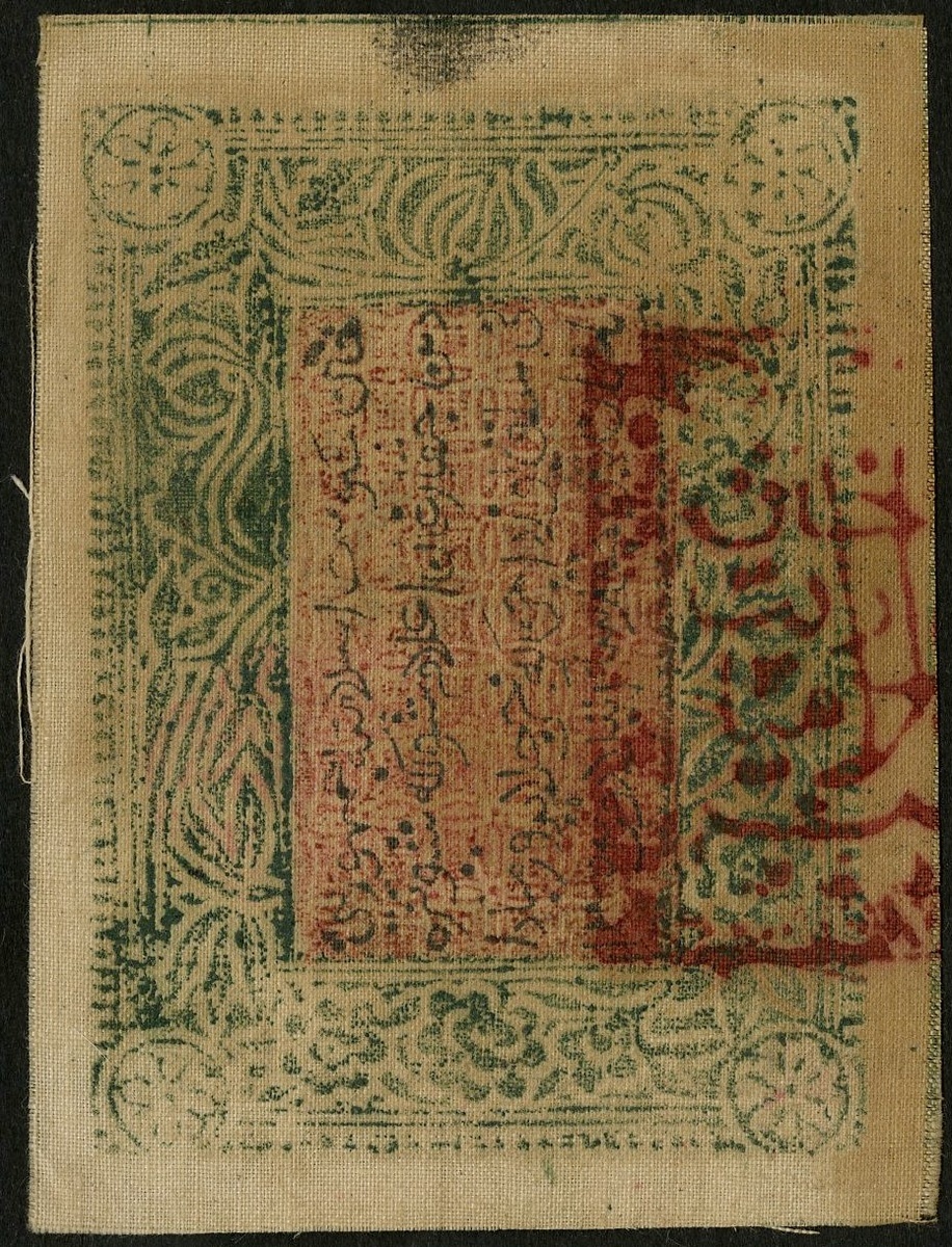 China. United Islamic Republic of East Turkestan. Revolutionary Government, Khotan. 100 Silver Dachin. AH 1352 (1933 AD). P-S3039. Thin-weave fabric. Dark blue-green, black text on red. Large red hand-stamped seal. About Very Fine.