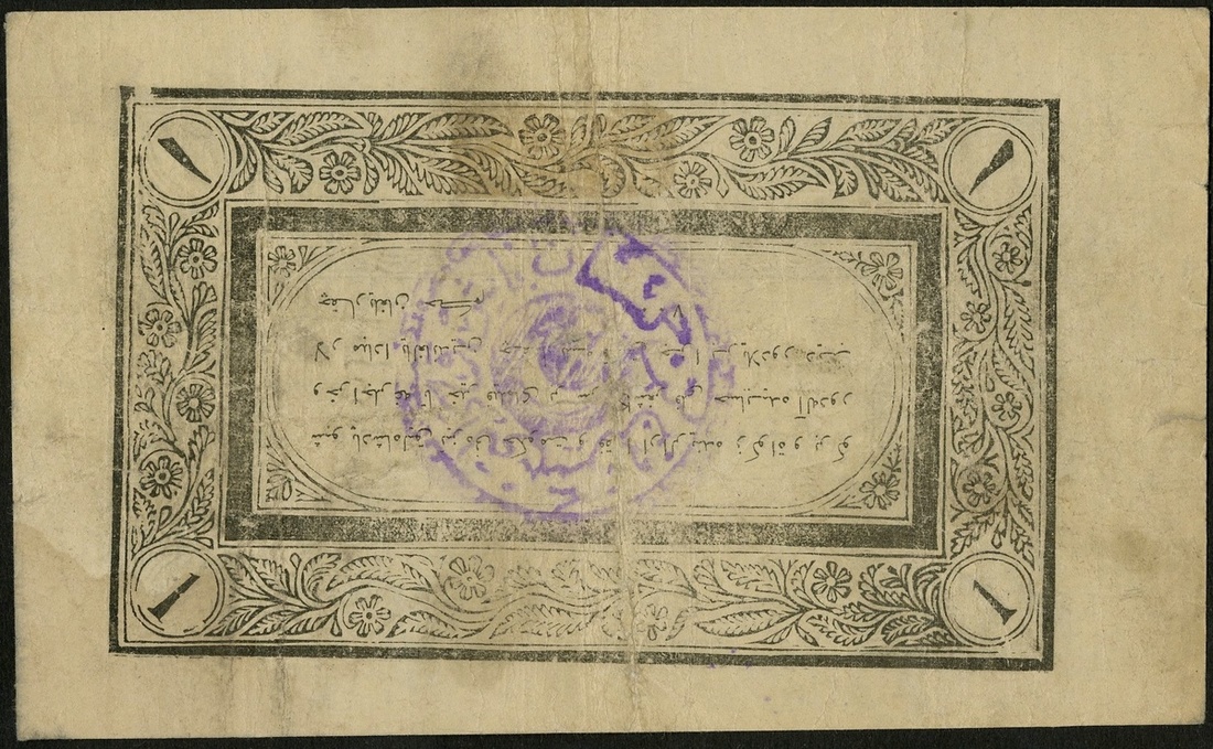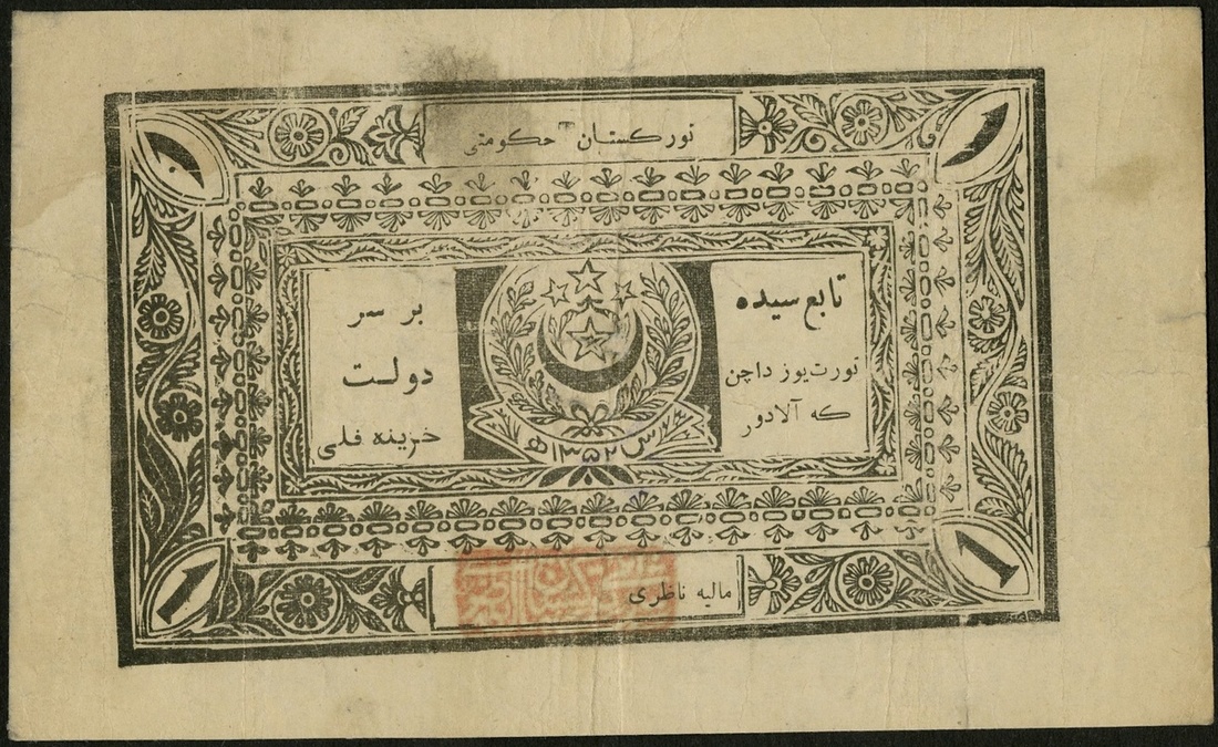 China. Islamic Republic of East Turkestan. 1 Sar. AH 1352 (1933 AD). P-3046b. Star and crescent at center. Scarce. Fine-VF.