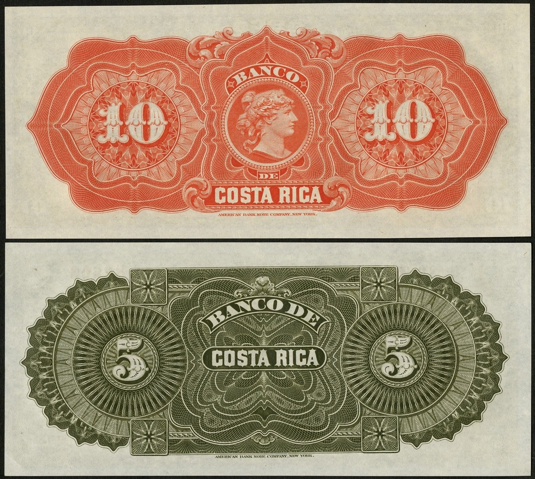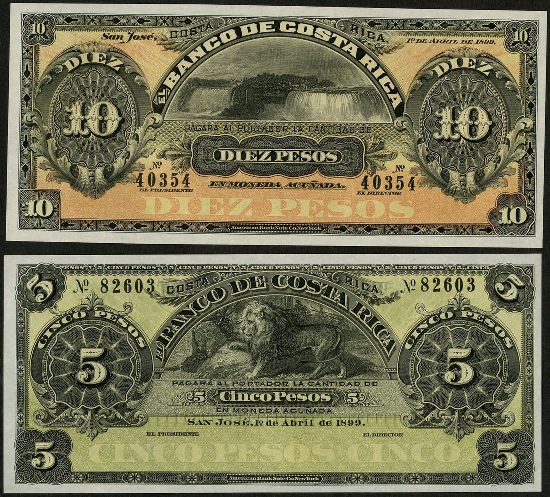 Costa Rica. Banco de Costa Rica. Pair. 5 and 10 Pesos. 1899. P-S163r1, S164r. Lion; Horseshoe Falls. Remainders. Crisp Uncirculated. [2]