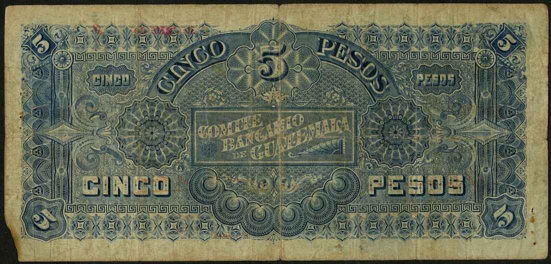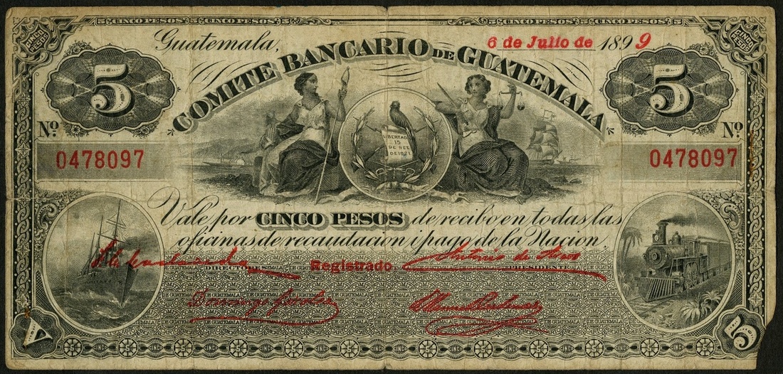 Guatemala. Comite Bancario de Guatemala. 5 Pesos. 1899. P-S192. Arms flanked by Liberty and Justice, steamship lower left. Registrado in red. Very scarce. Missing bottom right edge, Fine details.