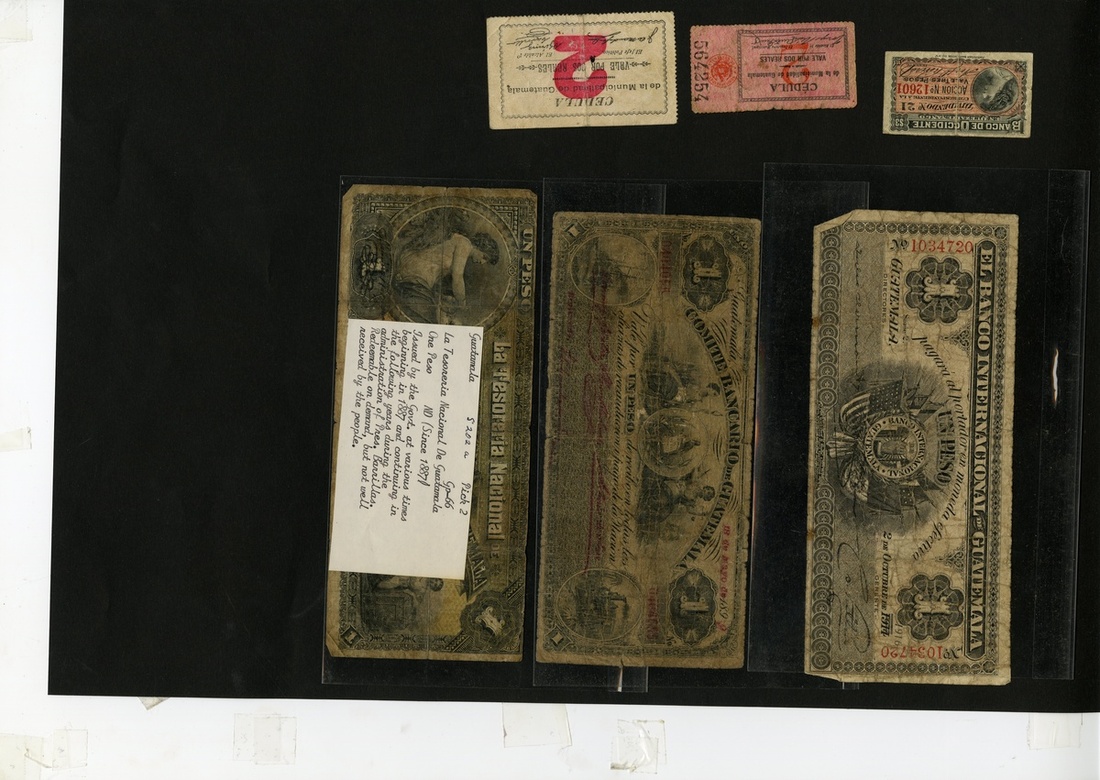 Guatemala. Lot. Tesorería Nacional de Guatemala. 1 Peso. ND (ca. 1882). P-202a. Pinholes. About VG; Cedula de la Municipalidad de Guatemala. 2 Reales (2). White, purple inkstamp on back; red; columned walkway on back.Fine; Banco Internacional de Guatemala. 1 Peso. 2 Oct. 1916/14. P-S152b. Good; Comite Bancario de Guatemala. 1 Peso. 18 May 1899. P-S191. Good; also Banco de Occidente Dividend Coupon 3 Pesos. [6]
