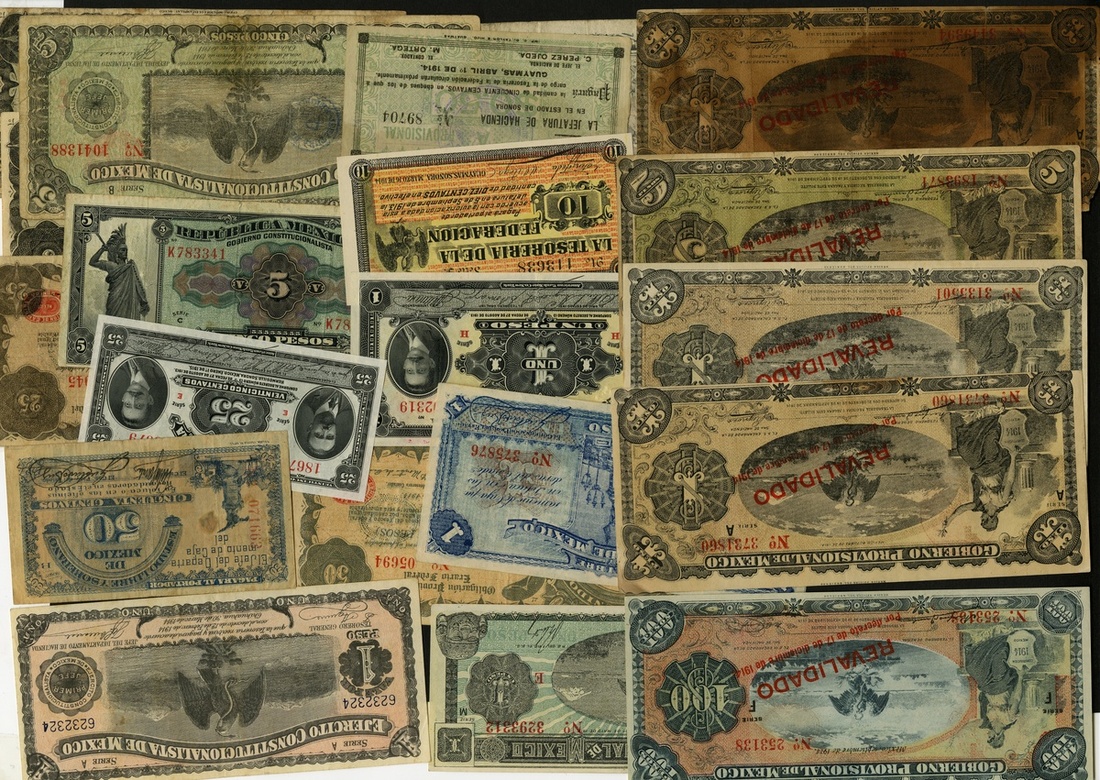 Mexico. Revolutionary Lot. Includes: Chihuahua. P-S523. 524 (old tape on split); Distrito Federal. P-S683, 685 (2), 686, 687, 688 (VF), 689 (EF), 701b (3), 702b (2), 708b, 709, 712, 713, 714, 715, 717; Toluca. P-S879, 881 (2), 882 (4); Sonora. P-S1056b, 1058, 1061, 1069 (5), 1070 (4), 1071, 1073. Generally Fine-Unc; also misc. Banco de Mexico notes (13), ca. 1943-1970.