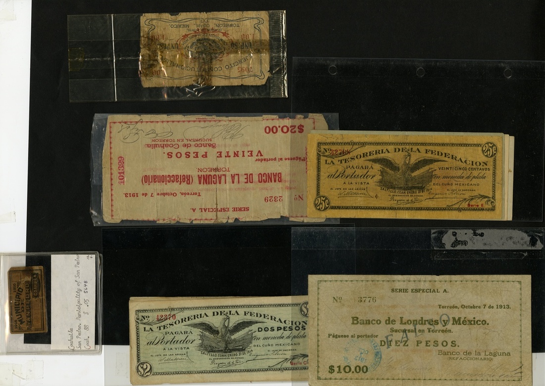 Mexico. Revolutionary. Coahuila. Lot. Banco de la Laguna. 20 Pesos. 1913. P-S566a. Paper backing back center. About VG; Banco de Londres y México. 10 Pesos. P-S593b. VG-Fine; La Tesorería de la Federación, Saltillo. P-S642, 643, 645, 646 (5). The 25 Centavos About VG, the other About Fine-EF; Municipio de San Pedro. P-S648. Paper loss on back, VG; División del Norte. Torreón. P-S654. Splits taped. Good. [12]