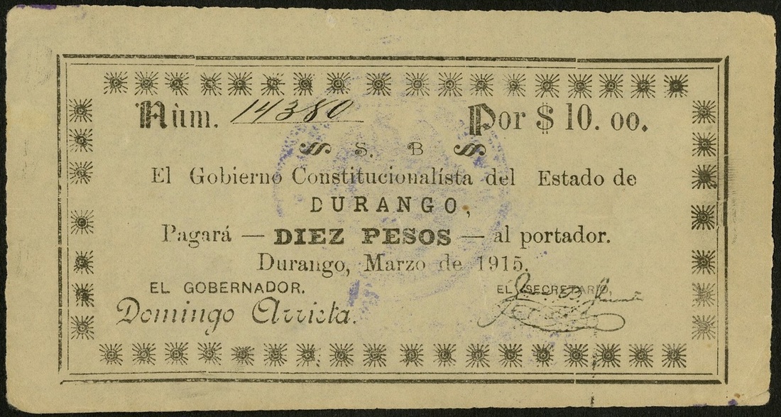 Mexico. Revolutionary. Durango. Gobierno Constitucionalista del Estado de Durango. 10 Pesos. March 1915. VF.