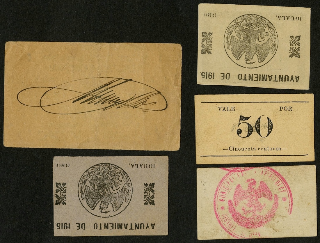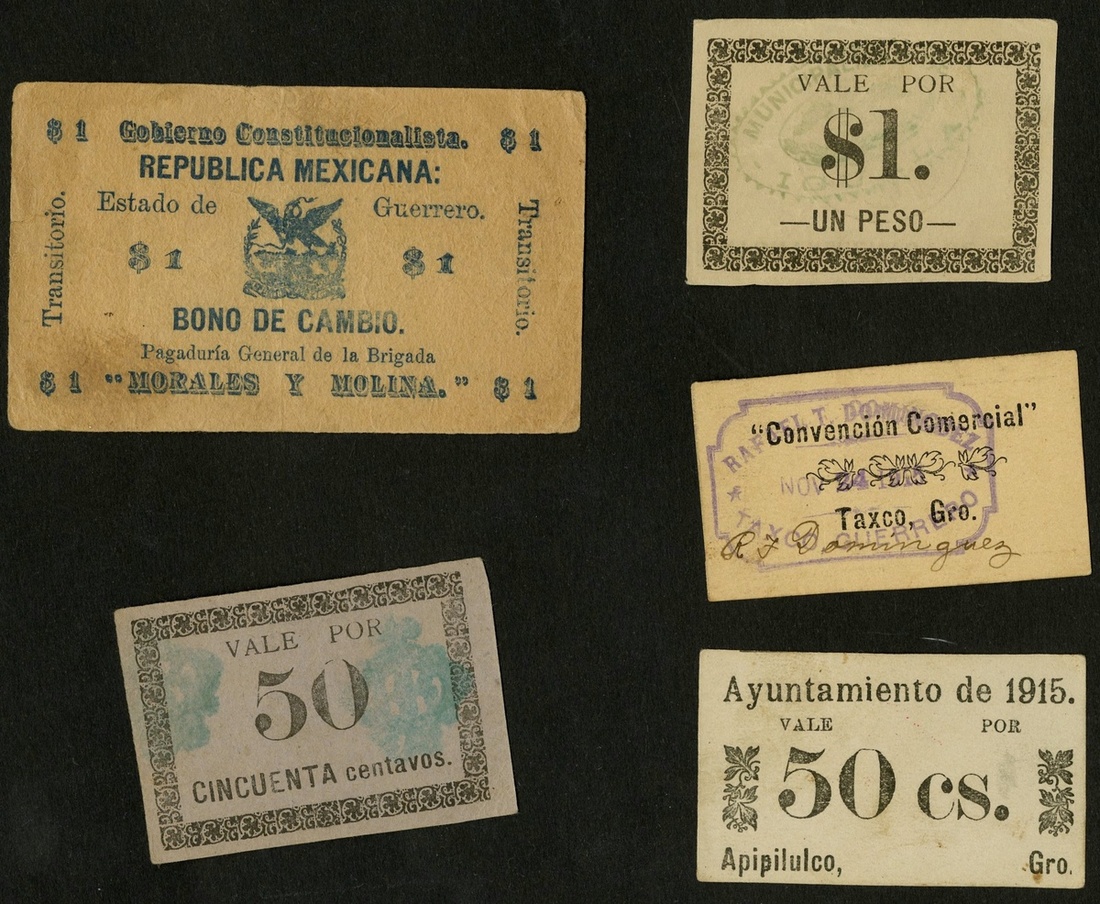 Mexico. Revolutionary. Guerrero. Lot. Ayuntamiento de 1915, Iguala. 50 Centavos and 1 Peso. P-S807, 808. Gray pasteboard; Pale yellow paper. Unc; Gobierno Constitucionalista, Brigada Morales y Molina. 1 Peso. P-S822. Fine; Ayuntamiento de 1915, Apipilulco. 50 Centavos. Gro.19. VF; Convencion Comercial, Taxco. 50 Centavos. Pasteboard. EF. [5]
