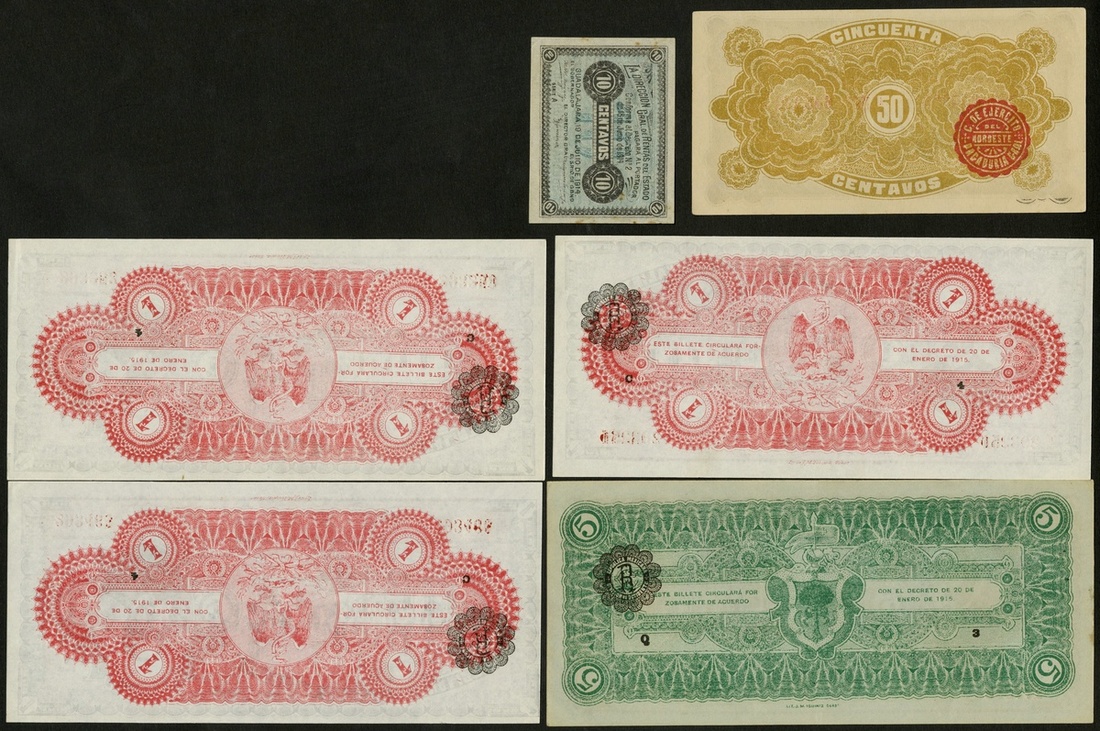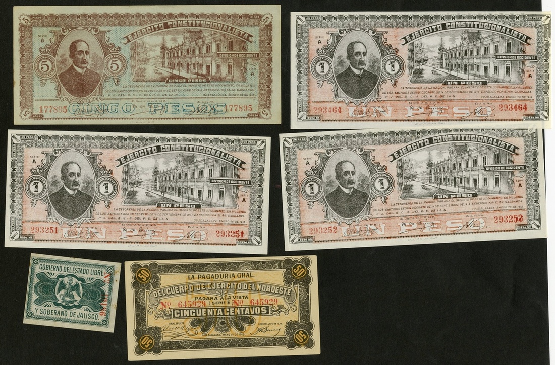 Mexico. Revolutionary. Jalisco. Lot. La Dirección General de Rentas del Estado, Guadalajara. 10 Centavos. 1914. P-S845a. A few rust spots. EF; Ejército Constiticionalista, División de Occidente, Guadalajara. 1 and 5 Pesos. 1915. P-S860 (3) Unc., P-S861 EF-AU; La Pagaduria Gral. Del Cuerpo de Ejército del Noroeste. 50 Centavos. 1915. P-S868. EF-AU. [6]