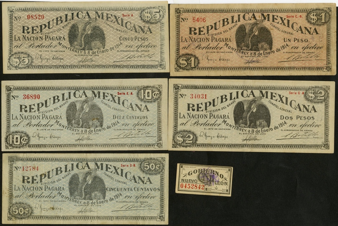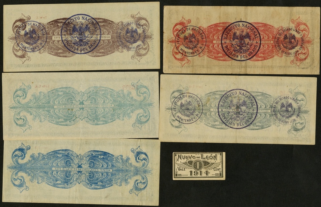 Mexico. Revolutionary. Nuevo León. Lot. Gobierno de Nuevo León, Monterrey. 1 Centavo. P-S934; Divisón del Brava, Monterrey. 10 and 50 Centavos, 1 Peso, 2 and 5 Pesos. 1914. P-S934, 935, 936, 937. 938, 939. The Peso Fine, the others VF-EF. [6]