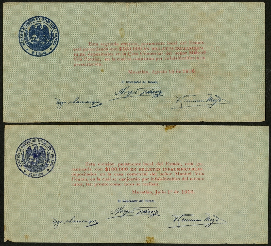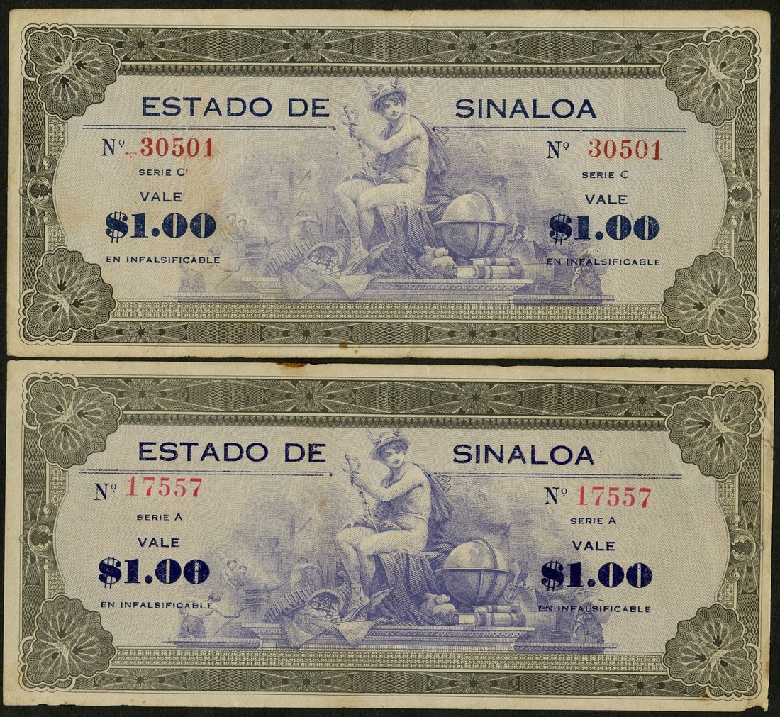 Mexico. Revolutionary. Sinaloa. Estado de Sinaloa, Mazatlán. 1 Peso (2). June 1 and August 15, 1916. P-S1005, 1007. Mercury seated with globe at center. Minor rust spots in margin, the first with nicked bottom right corner. Fine, About VF. [2]