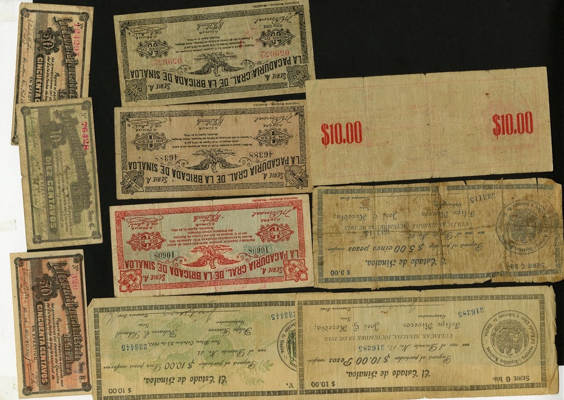 Mexico. Revolutionary. Sinaloa. Lot. Includes: P-S997. VG; P-S1000, 1001. VG and Good (back tape repairs); P-S1016, 1017, 1019. Fine missing one cornertip, VG, Fine, P-S1022, 1024, 1025. VG, Fine, VF; P-S1040. Nicks and fold at left edge, About Fine.