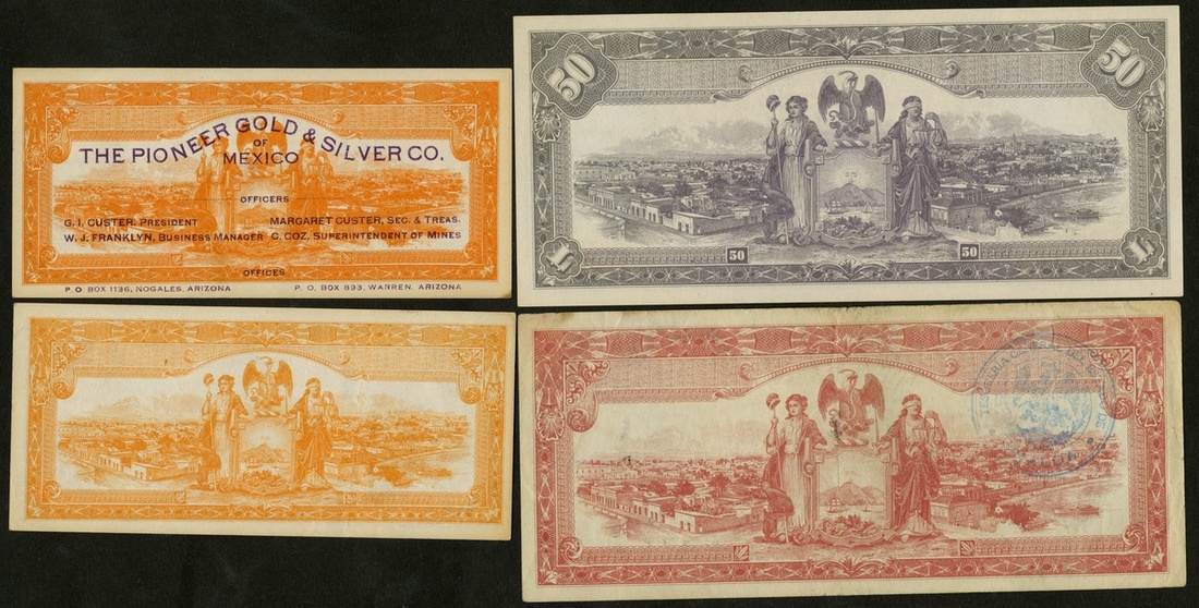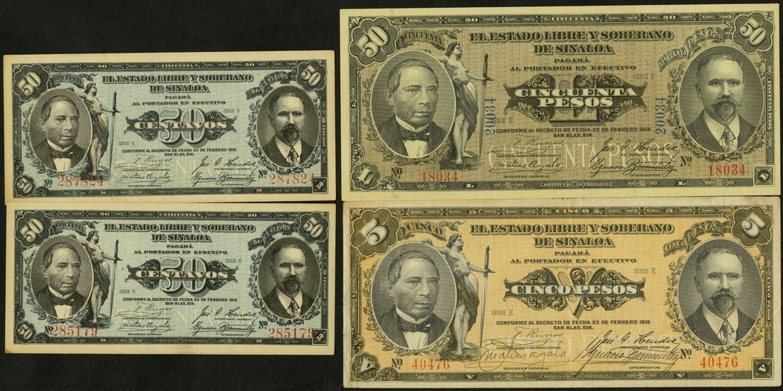 Mexico. Revolutionary. El Estado Libre y Soberano de Sinaloa. Quartet. 50 Centavos. P-S1042 (2). One with "The Pioneer Gold & Silver Co. of Mexico, Nogales AZ overprint on back. AU-Unc; 5 Pesos. P-S1044b. Two printed and two handwritten signatures. VF; and 50 Pesos. P-S1047a. AU. Juarez portrait at left, Madero at right. [4]