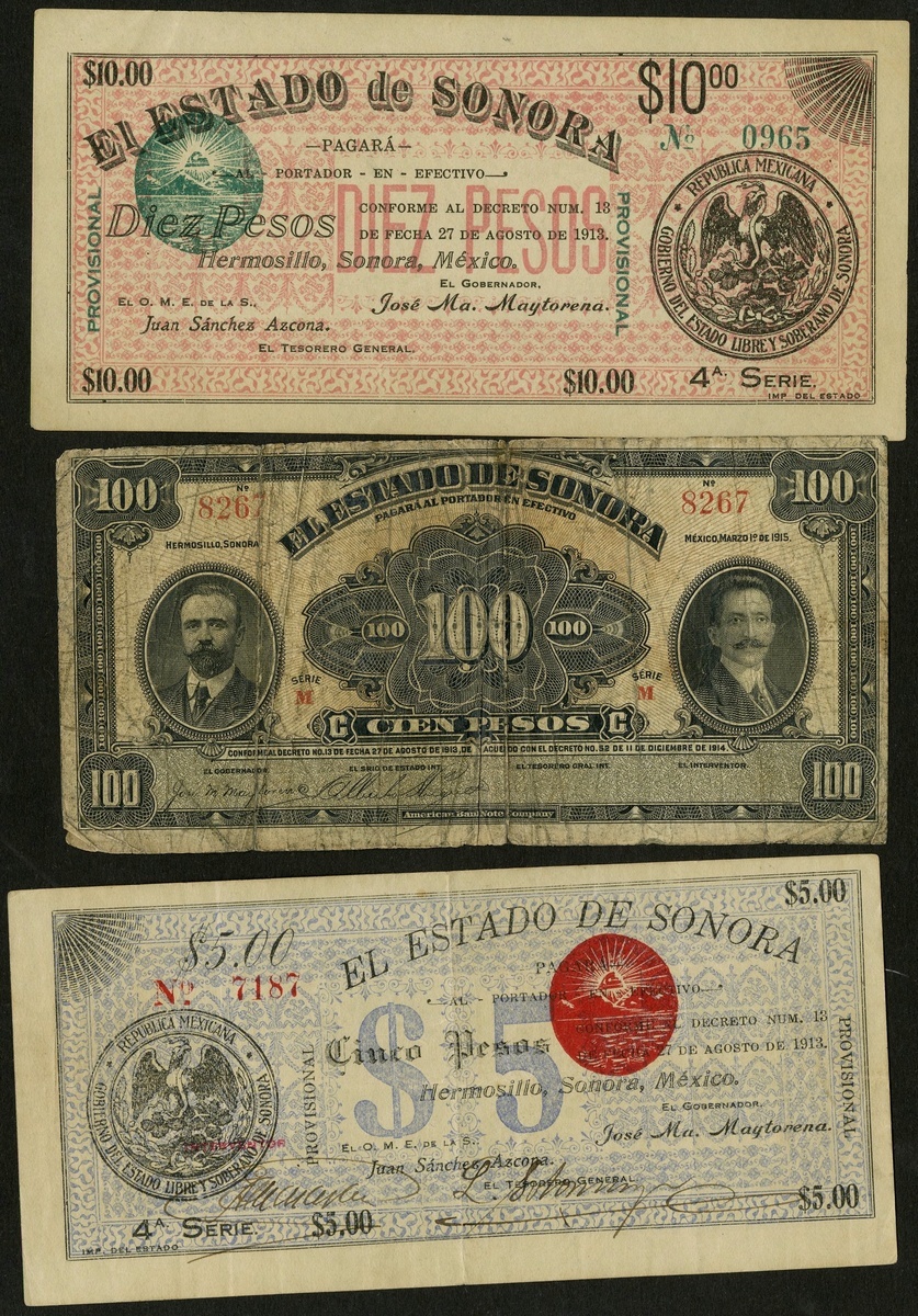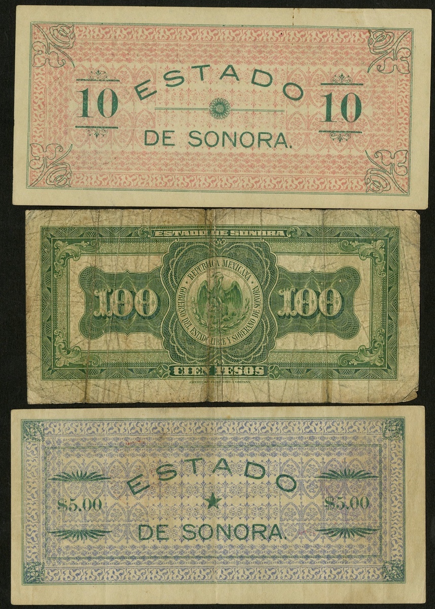 Mexico. Revolutionary. El Estado de Sonora, Hermosillo. 5 and 10 Pesos. 4th Series, L. 1913. P-S1067, 1068. VF, EF; and 100 Pesos. P-S1076r. VG. [3]